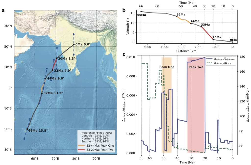 基于以上思路,中国科学院地质与地球物理研究所博士研究生吴啸岳与导师刘丽军研究员、陈凌研究员、南方科技大学胡佳顺副教授、以及中国科学院广州地球化学研究所刘亮副研究员合作提取新生代印度板块旋转信息,并结合地球动力学数值模拟,定量约束了古近纪印度大陆与欧亚大陆的碰撞过程。基于最新的全球板块重构,研究团队首先得到印度板块上南北两个参考点的运动轨迹,它们的连线方位角变化反映了印度板块的旋转特征(图1)。结果显示新生代印度板块存在两个逆时针旋转的峰期,较早的一期在52-44 Ma,旋转速率约0.006 /km,其间伴随着印度大陆的显著减速;较新的一期在33-20 Ma,旋转速率约0.010 /km,其间印度大陆的运动速度与现今相近。两个峰期的旋转速率均显著高于背景平均的0.003 /km。