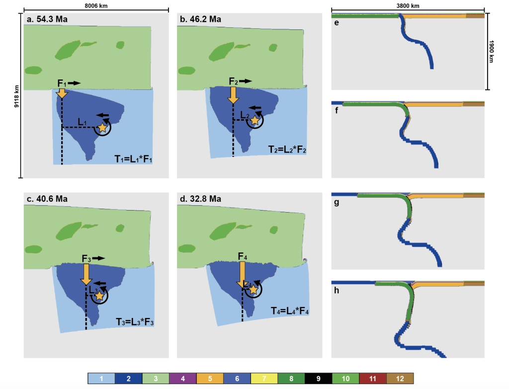 随后研究团队实施了一系列三维自由俯冲地球动力学数值模拟实验,基于前人提出的碰撞模式设计了三组模型,分别包括西侧、中间、东侧突出的印度大陆北缘形态。随着模型的演化,印度板块在俯冲板片的拖拽作用下持续向欧亚板块汇聚,伴随着显著的逆时针旋转(图2)。对于西侧与中间突出的印度大陆模型,均能够提取到两个逆时针旋转峰期,与观测拟合较好(图3)。在这两种模型中,印度与欧亚的初始和完全碰撞均早于旋转峰期5-10 Myrs,这种时间差异取决于阻力力矩的演化。取印度板片的几何中心为质心,在初始碰撞阶段,当印度与欧亚陆壳最初接触时,碰撞阻力与力矩均不显著,因此无法产生显著旋转。随着碰撞的持续进行,大陆的碰撞范围逐渐扩展,此时碰撞阻力与力矩显著增大,形成了第一次旋转峰期。当进一步发展为全面碰撞时,力臂减小的效果逐渐显著,力矩随之减小,伴随着旋转速率的下降(图3)。上述定性分析可通过定量的力矩计算加以验证。大陆全面碰撞之后,随着印度上地壳的不断剐蹭与上覆板块的持续变形,板块之间的耦合显著增强,碰撞阻力及力矩增大,形成第二次旋转峰期。东侧突出模型无法得到第一次峰期,与观测拟合较差。这是由于初始碰撞发生在质心东侧,随着碰撞进行,力臂与力矩首先减小为零,无法产生额外的旋转(图3)。