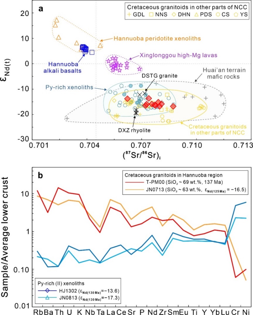 中国科学院地质与地球物理研究所的博士研究生赵朗,在导师姜能研究员的指导下,与郭敬辉研究员以及其他合作者,将华北克拉通北缘张家口地区代表晚太古代基性下地壳的怀安地体中的基性麻粒岩、代表所谓新生下地壳的汉诺坝玄武岩中的基性麻粒岩捕虏体,以及下地壳起源的中生代花岗岩三者相结合,通过对这三类岩石的元素/同位素地球化学对比研究,发现了其成因联系的新规律: