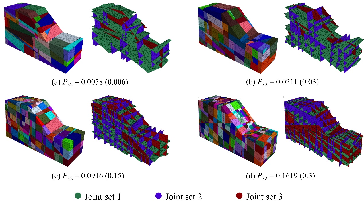 中国科学院地质与地球物理研究所页岩气与地质工程院重点实验室祁生文研究员率领团队开展了岩质边坡大型振动台试验,通过振动台实验结果校核了三维块体离散元边坡数值模型,并以此为基础,通过P32(Volumetric Fracture Intensity)控制边坡的节理密度,建立了一系列含有三组典型结构面的三维节理状结构边坡(图1),精细模拟了节理状结构边坡在不同频率地震波激振下的坡表动力响应。