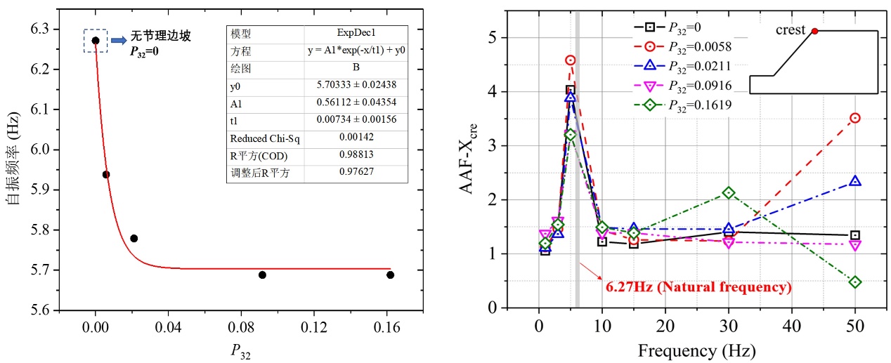 研究结果表明,节理状结构边坡的自振频率随着节理密度的增加而降低,其变化规律符合单指数衰减幂函数(图2左)。即在边坡节理密度较小时,随着节理密度的增加,边坡自振频率经历了快速的下降;当节理密度增加到一定程度时,边坡的自振频率趋于稳定,基本不再随着节理密度的增加而变化。