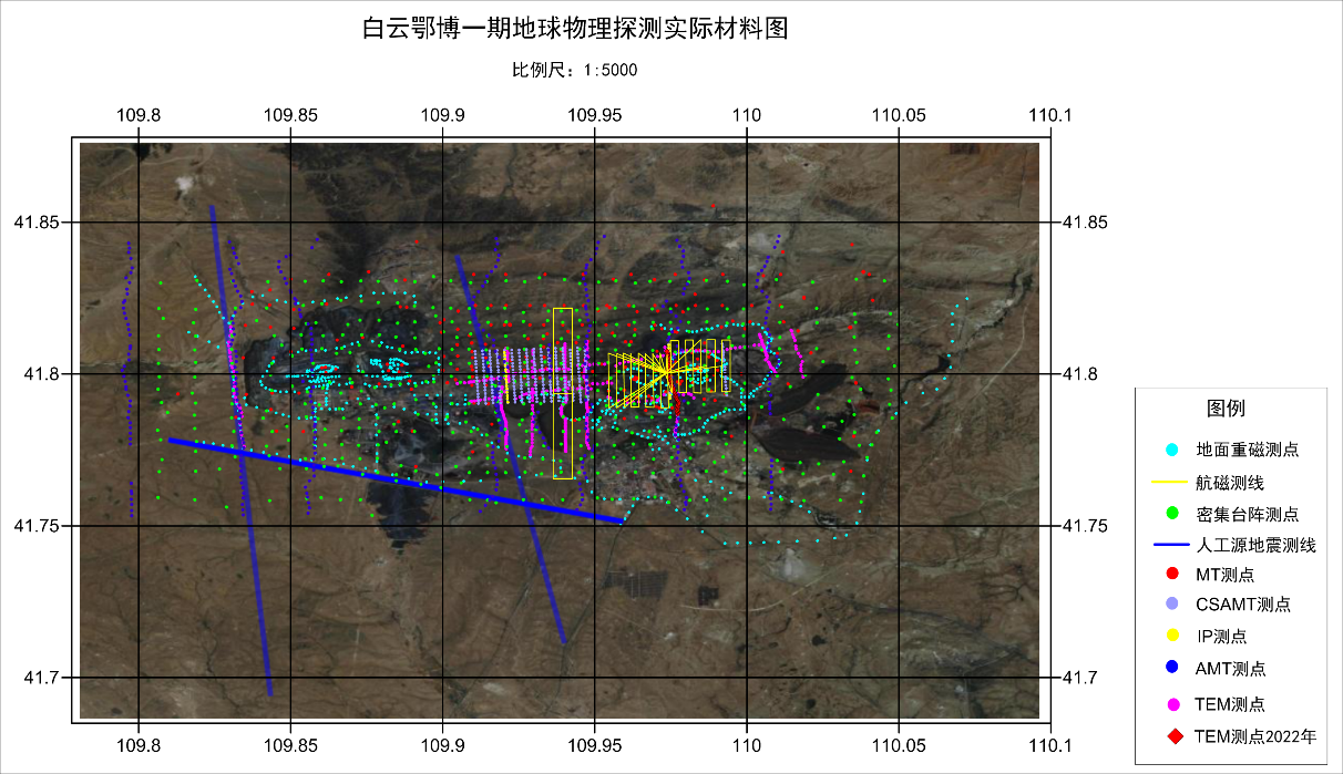 内蒙古白云鄂博矿是全球第一大稀土矿床、第二大铌矿床,并且蕴藏了丰富的铁、钪、钍及萤石等矿产资源,是举世闻名的“资源宝库”。自1927年发现以来,国内外学者围绕白云鄂博矿的地质学、矿物学、成矿年代学、矿床成因等开展了大量研究,取得了丰硕的研究成果。但受限于钻井深度和以往地球物理探测精度,矿区内深部构造格局、矿体(赋矿碳酸岩)空间形态等问题,长久以来未得到明确阐述,成为白云鄂博矿床成矿机理研究和资源量预测的制约。为厘清赋矿碳酸岩的深部空间形态,解析白云鄂博矿床成矿过程和机制,预测稀土、铌等关键矿产的资源量,中国科学院地质与地球物理研究所地球物理探测团队在白云鄂博矿区开展了综合地球物理工作,实施完成了包括岩石物性测试、电磁法、背景噪声成像、反射地震、重磁等多种地球物理方法在内的探测(图1),取得了新的研究进展和成果。