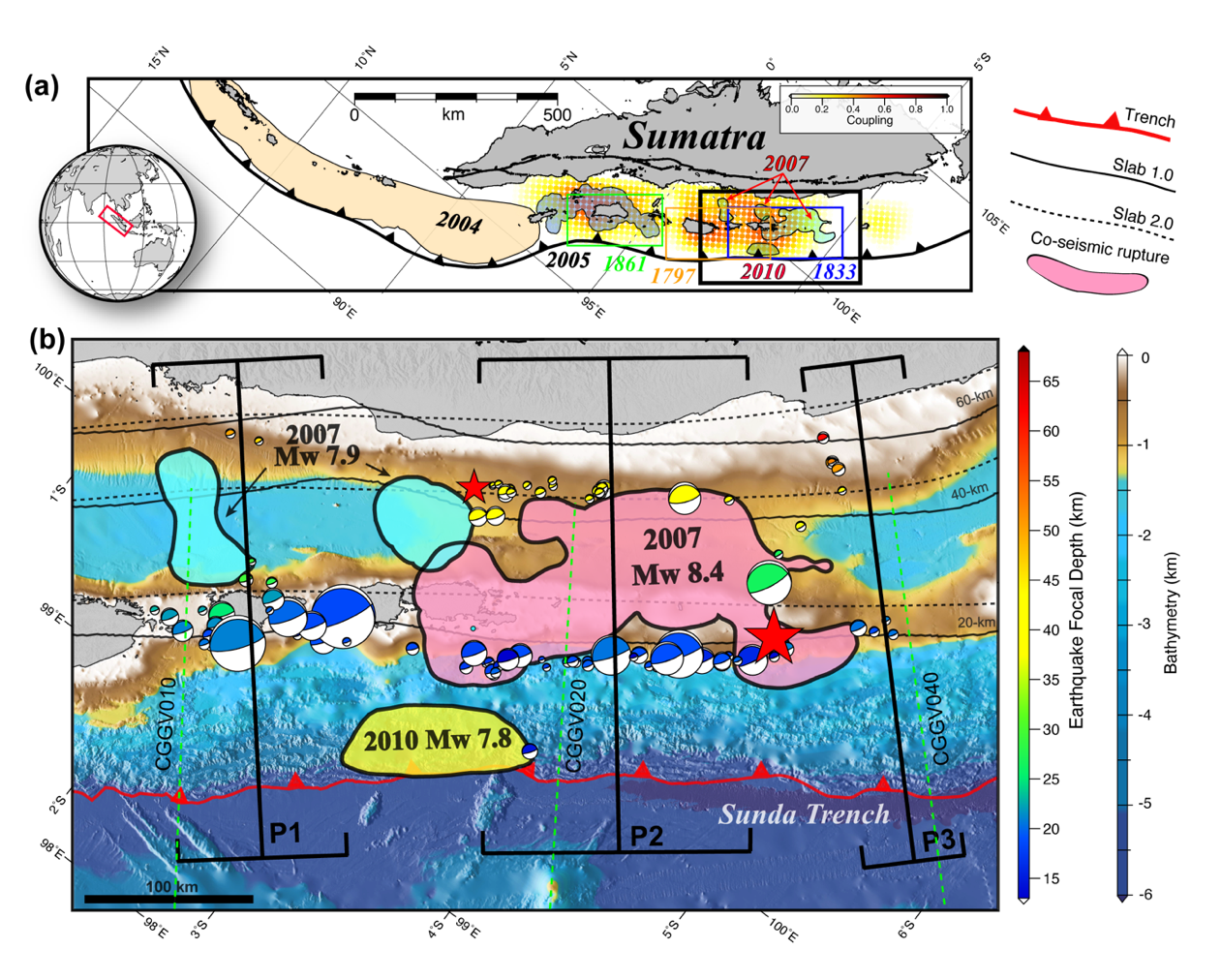 中国科学院地质与地球物理研究所王新特聘研究员、韦生吉客座研究员、陈凌研究员、郝天珧研究员、赵亮研究员及其合作者,发展了基于全球远场地震波波形模拟和分析的系列方法(图1),并将其应用于苏门答腊俯冲带Mentawai地区。通过波形反演、地震深度震相模拟以及远震面波相对定位等一系列手段(图1),精细地约束了1990年至2017年间该地区108个中等震级地震的位置和震源机制解(图2和图3)。综合历史大地震和重力/地形异常分析,识别出了断层几何和闭锁状态在沿着走向和倾向的变化,认为该区域2007年发生的Mw8.4(Bengkulu)地震破裂了断层上一个永久性凹凸体,而2010年的Mw7.8(Mentawai)海啸型地震则对应更为不规则的发震周期。