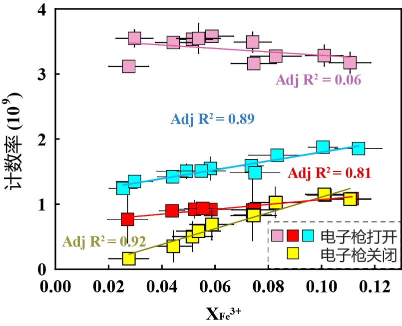 分析过程中,所有样品在未进行电荷中和的情况下,其点对点重复性(2SD=±0.5‰ ~ ±1.3‰)明显差于电子枪开启状态(2SD=±0.3‰ ~ ±0.7‰)。此外,铬铁矿的电导率随其主量元素组成的不同而变化,体现在二次离子计数率随着XFe3+(Fe3+/(Fe3++Al+Cr))含量降低而降低(图3)。因此,在利用SIMS测量铬铁矿的O同位素时,进行电荷中和是必不可少的。