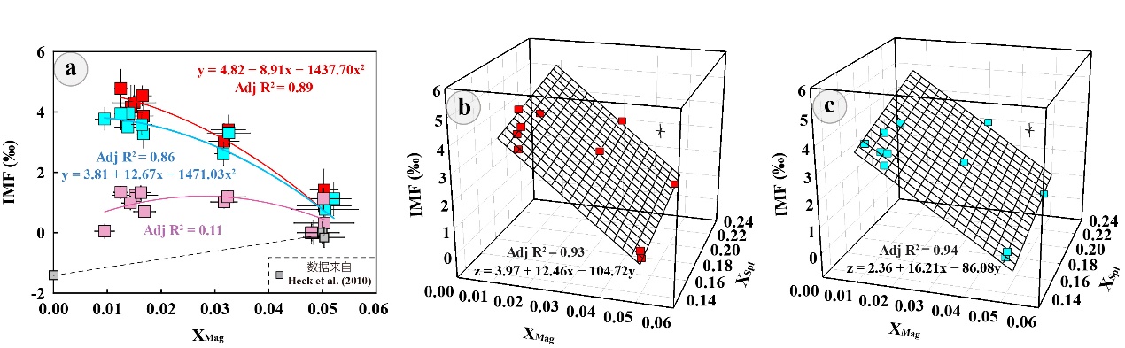 此外,SHRIMP SI表现出显著的基质效应,与使用 CAMECA IMS-1280 时在相同样品上观察到的相当温和的基质效应形成对比。其中控制SHRIMP SI测试过程中基质效应的主要因素是矿物中磁铁矿(FeOFe2O3,XMag)端元和尖晶石端元(MgAl2O4,XSpl)的比例(图4)。该研究建立的成分依赖的基质效应校正方程,为铬铁矿O同位素原位分析提供了可靠的方法。