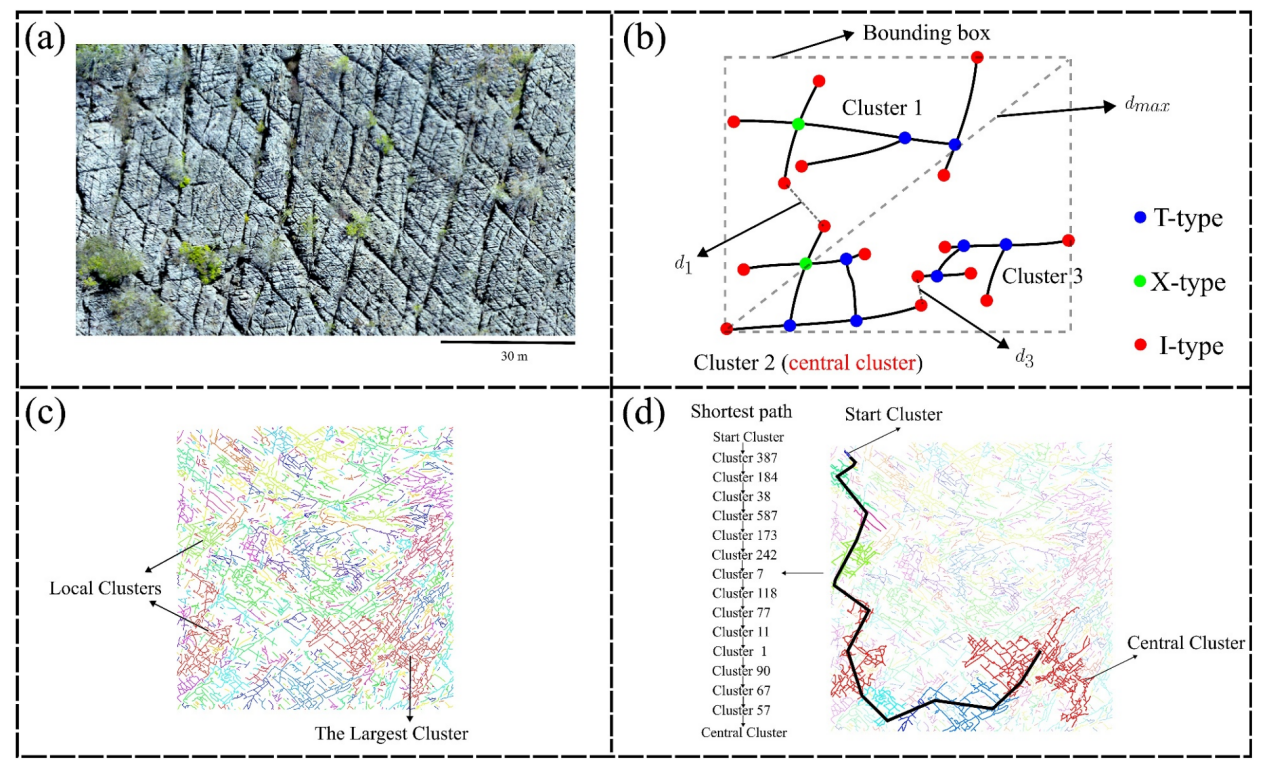 图1 (a) 巴西Irecê盆地的Brejões裂缝露头(Prabhakaran et al.,2019);(b) 简单多集群裂缝网络示意图,包含三个裂缝集群,方程(1)中使用的不同距离标注及T型、X型和I型节点用不同颜色标记; (c) 挪威西部Hornelen盆地的裂缝露头(N. E. Odling,1997),其中不同裂缝集群用不同的颜色标记;(d) 起始裂缝集群和中央集群之间的最短距离,该距离沿最短路径穿越多个中间集群,是在可渗透基质中的最小距离