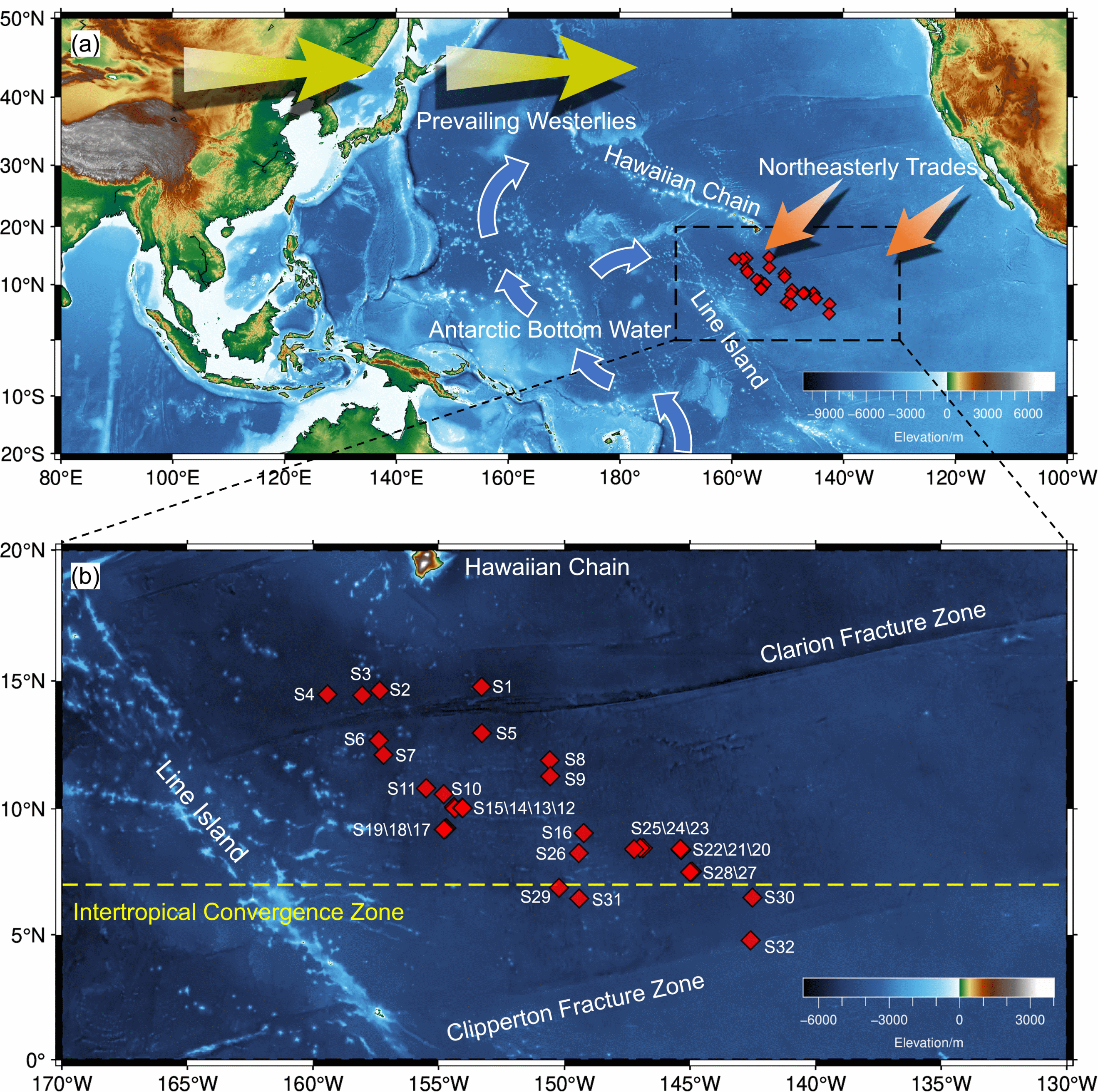 最近,中国科学院地质与地球物理研究所李金华研究员团队与国内外合作者,综合运用岩石磁学、电子显微学和地球化学技术,对32个不同点位的表层沉积物开展了研究(图1),量化识别了磁性矿物的类型及其空间分布特征,发现多金属结核的分布与趋磁细菌磁小体丰度之间存在相关性,为理解多金属结核生长过程中的微生物-矿物相互作用提供了新证据,也为深入认识深海趋磁细菌生态分布规律及其参与和记录的生物地质过程提供新线索。