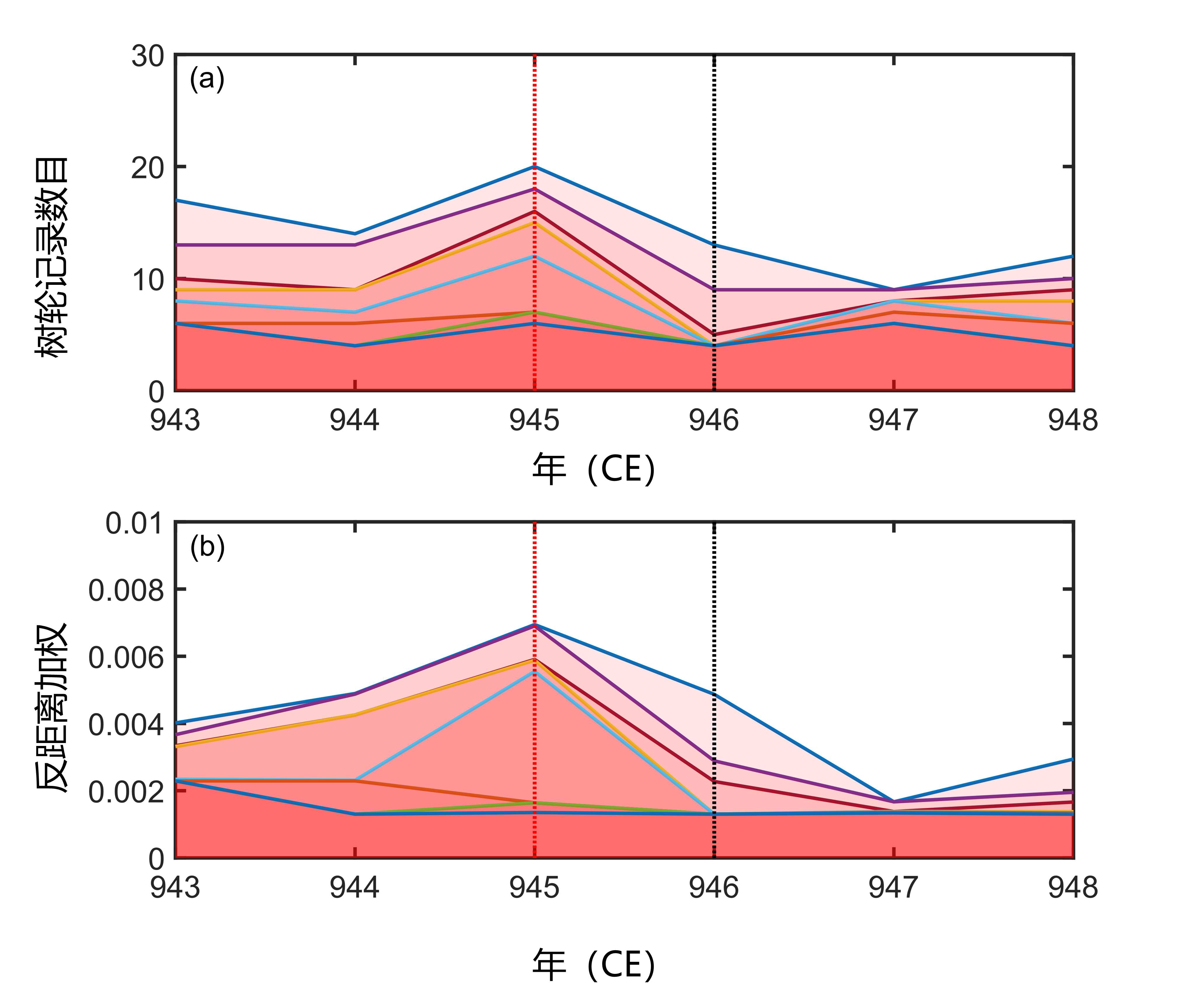 代用记录分析结果表明,亚洲、加拿大、欧洲和美国树轮宽度在公元945年出现了显著负异常(图1)。时序叠加分析方法(Superposed Epoch Analysis,SEA)分析表明,研究选取的树轮宽度记录大部分在火山喷发次年显著降低,这说明火山强迫与树轮宽度的负异常之间可能存在着密切的联系(图2)。因此,树轮记录在公元945年显著的负异常可能指示了千年大喷发的发生和其显著的气候影响。由于树轮宽度对强火山喷发的响应可能存在时滞效应,研究推测千年大喷发的时间可能在公元944–945年。