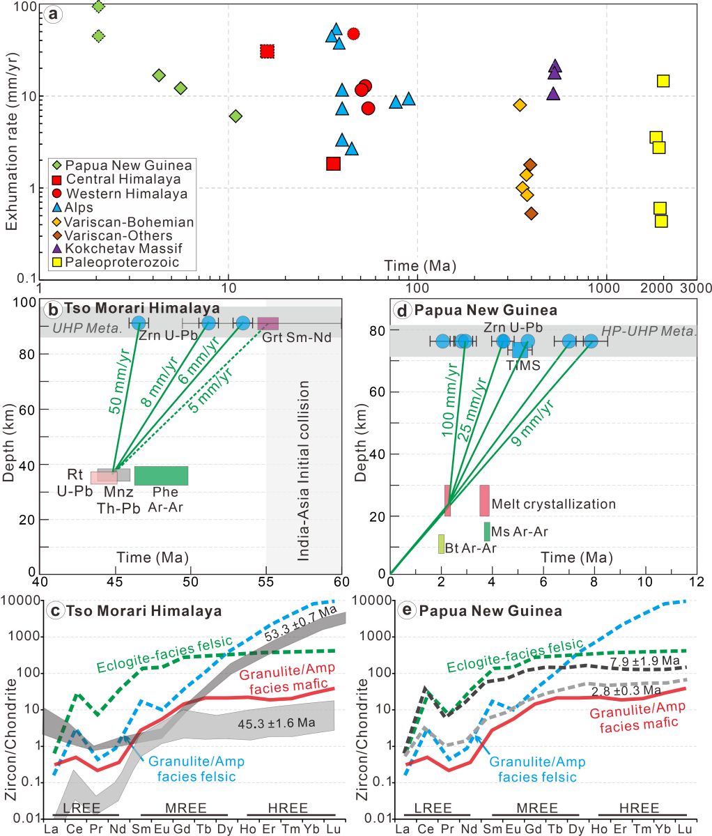 图5 根据锆石变质年龄计算所得的(a)全球典型榴辉岩折返速率及具体实例:(b,c)印度西北Tso Morari榴辉岩;(d,e)巴布亚新几内亚榴辉岩