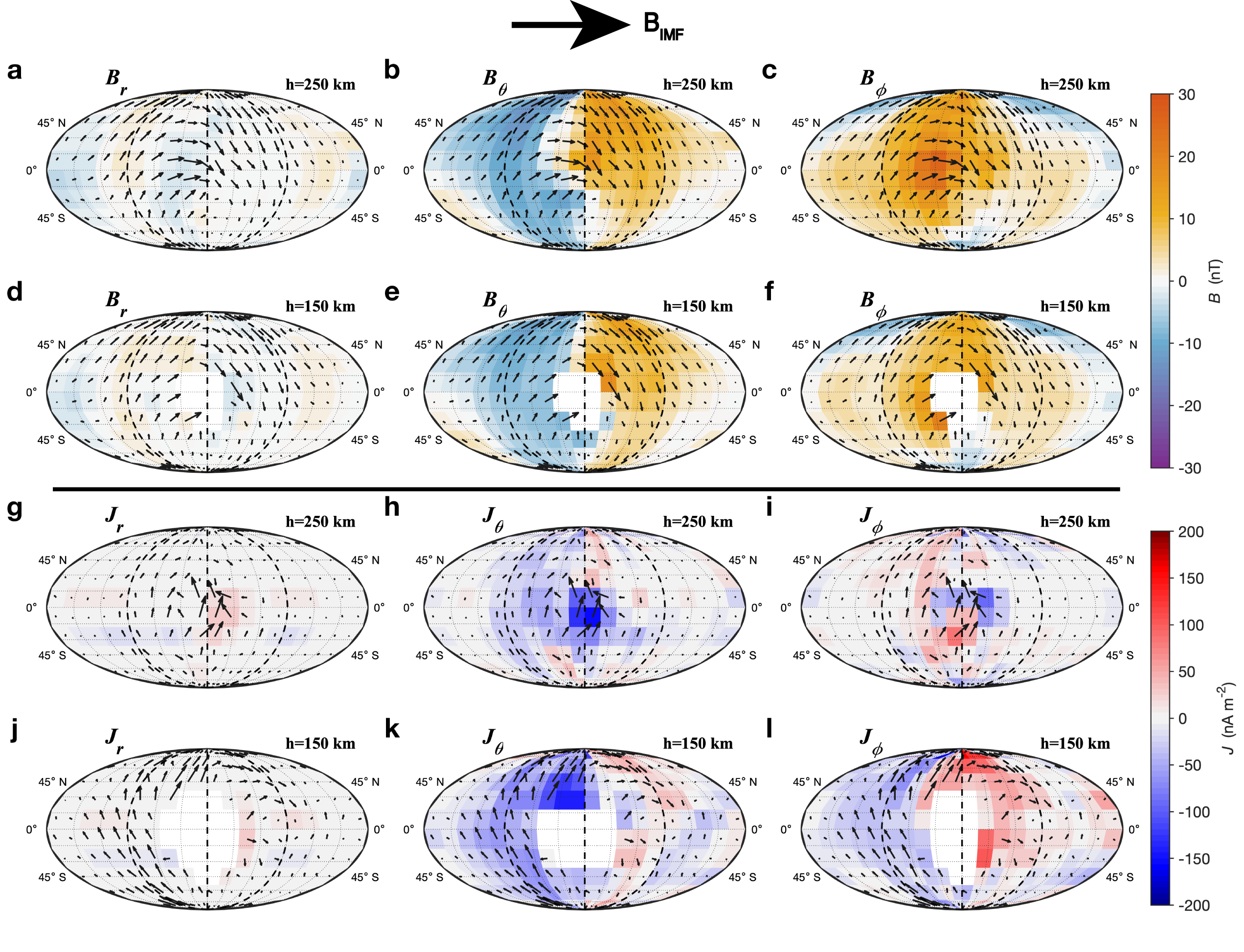 图3 火星电离层高度的磁场(a-f)和电流(g-l)在太阳风电场坐标系下分布。(a-f)电离层高度磁场三分量在150km和250km的分布规律;(g-l)电离层高度电流三分量在150 km和250 km的分布规律