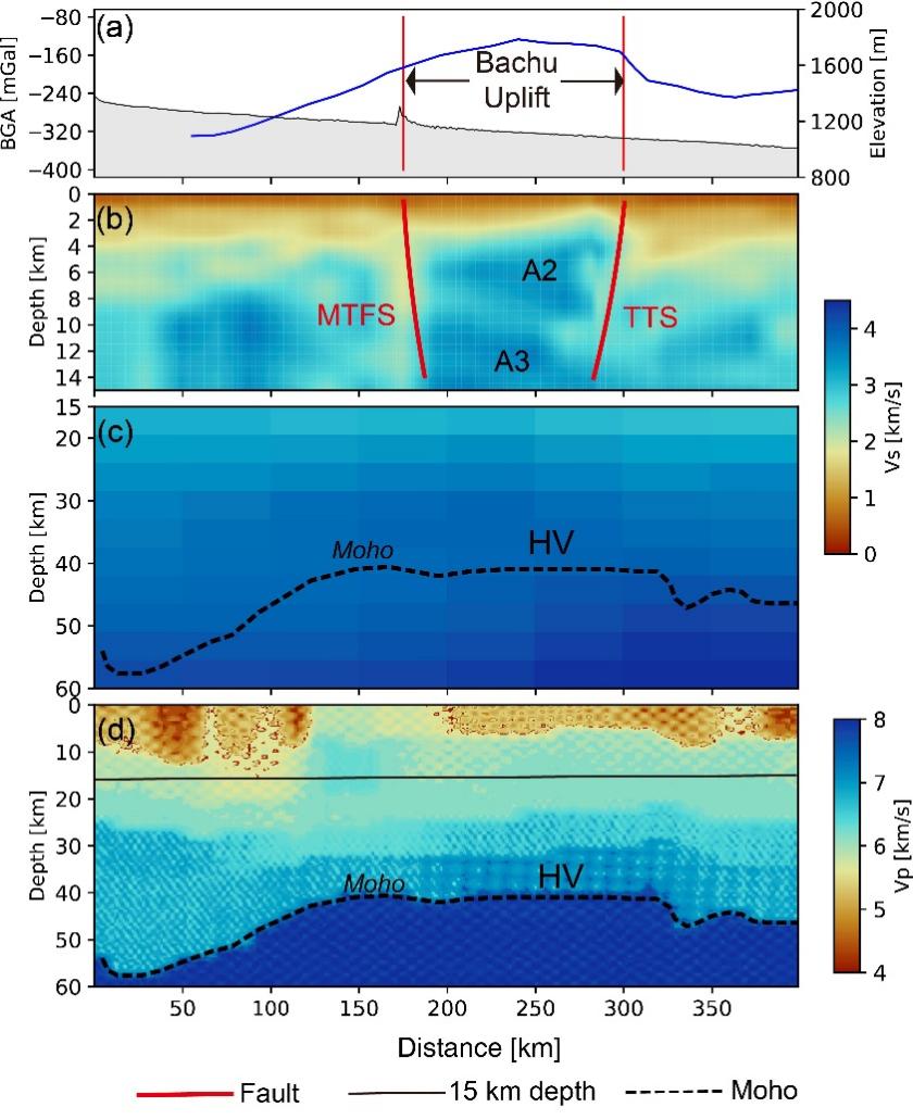 图3 剖面AA'沿线的不同地球物理观测。(a) 地形和布格重力异常(BGA)观测(蓝线);(b) 本研究得到的0-15 km深度范围内的Vs结构;(c) 基于环境噪声层析成像得到的15-60 km深度范围内的Vs结构;(d) 基于深地震反射剖面得到的0-60 km深度范围内的Vp结构。(a) 中的两条垂直红实线表示巴楚隆起的边界。红色实线表示剖面上的MTFS和TTS断层。(c) 和(d) 中40-60 km深度的黑色虚线表示莫霍不连续面。(d) 中的黑色实线表示15 km的深度。(c) 和(d) 中的注释“HV”表示巴楚隆起下地壳的高速度异常。在巴楚隆起处观察到明显的高BGA值,伴随其下地壳中的高Vp和高Vs异常