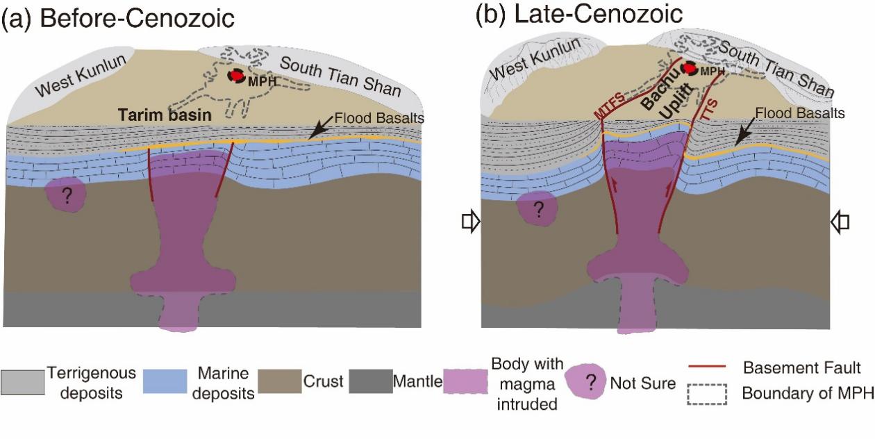 图4 新生代前(a) 和晚新生代 (b) 塔里木盆地西部地壳结构示意图。灰色虚线表示二叠纪地幔柱头部(MPH)。在(b)中,块体两侧的箭头表示来自新生代欧亚-印度碰撞传递的压应力。中下地壳中的岩浆侵入体形状和塔里木盆地西部的莫霍面起伏形态基于前人地球物理观测推断(图3)。在这种情况下,应变逐渐在岩浆侵入体与其围岩的边界附近累积,导致巴楚隆起两侧断层(MTFS和TTS)活动和地层隆起