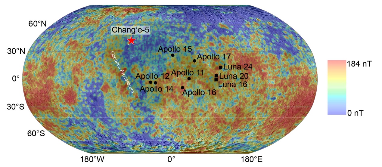 图1 月球表面磁异常分布图。五角星、圆形和方块代表嫦娥五号、阿波罗和月球号探测任务着陆点