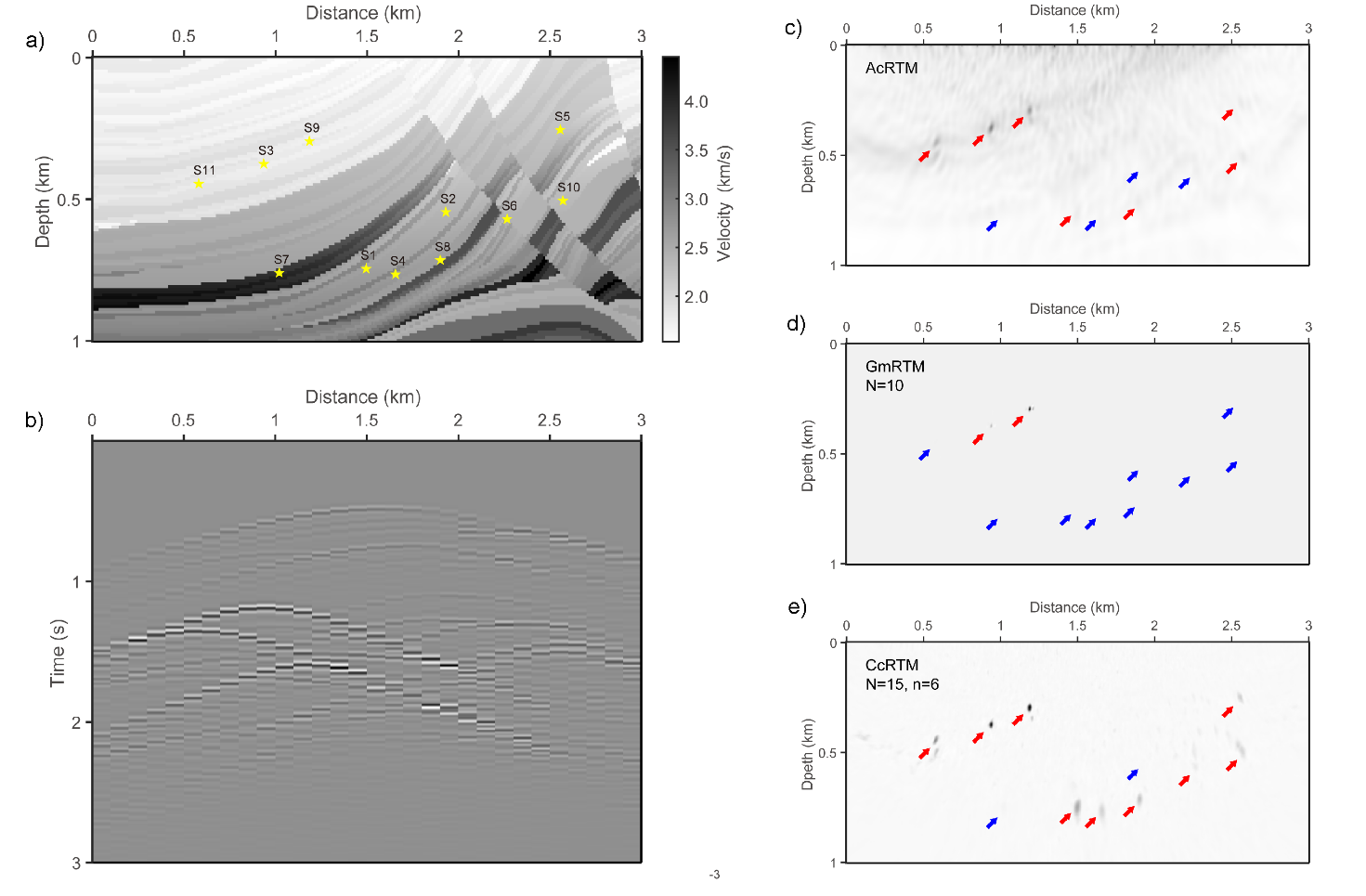 中国科学院地质与地球物理研究所深层油气理论与智能勘探开发重点实验室严天凡博士后与合作导师刘伊克研究员等人提出了一种组合互相关逆时成像方法(CcRTM),可以对多个震源进行高质量的成像并保持震源间的能量比。该方法首先对不同检波器的外推波场进行排列组合,将同一组合内的n个波场相乘来对震源进行成像,随后对成像结果开n次方根。求根计算能够平衡不同震源之间的能量,但也会引入额外的噪声。叠加不同接收器组合生成的图像可以有效抑制这些额外噪声。复杂数值模型的测试显示,该方法在保持较高信噪比和分辨率的情况下,实现了多个震源的同时成像(图1)。此外,由于平衡了不同震源的能量比,该方法显著提升了微震事件检测的灵敏度。因此,随着页岩油气压裂、地热资源开发以及二氧化碳封存等领域的迅速发展,该方法有望为地下储层的监测提供一种精细可靠的技术手段。