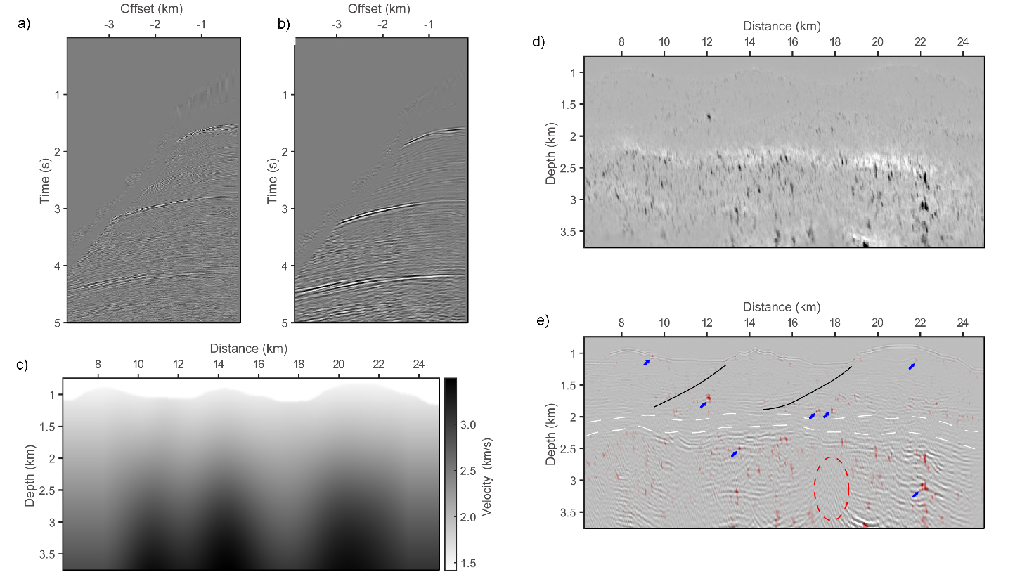 图2 所提出绕射波成像方法在实际海洋地震数据的成像效果展示。a) 原始地震记录;b)低频子波卷积后的地震记录; c)成像所用的速度模型; d) 激发时间组合互相关逆时成像方法(ETCcRTM)的结果; e)绕射波成像结果与逆时偏移结果的叠加