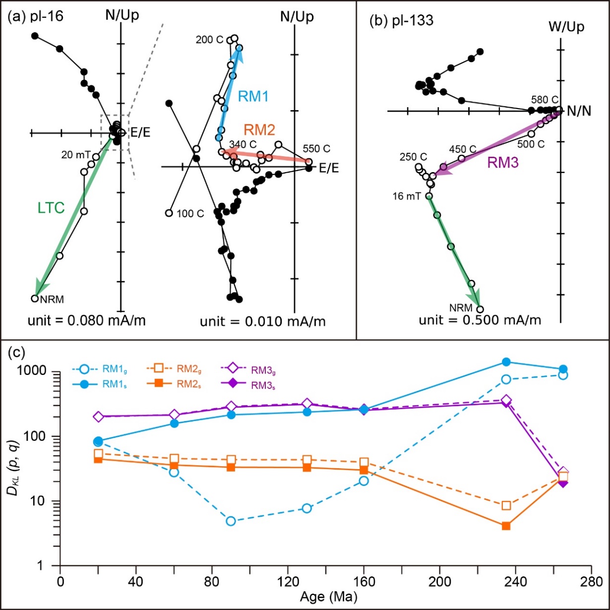 通过地质地球所多接收-电感耦合等离子体质谱实验室和南方海洋科学与工程广东省实验室(珠海)的方解石U-Pb年代学独立分析,交叉验证结果表明,蓬莱滩剖面碳酸盐岩至少经历了三期成岩过程,其年代分别为~126 Ma(早白垩世)、~223 Ma(晚三叠世)和~251 Ma(晚二叠世)(图1)。此外,系统的热退磁分析显示,蓬莱滩剖面碳酸盐岩样品在清除低温粘滞剩磁分量后,存在三期不同的剩磁分量(RM1、RM2、RM3)(图2a-图2b)。通过计算RM1、RM2和RM3三组分量对应的古地磁极,并与华南板块的视极移曲线进行对比,计算二者之间的差异度(DKL(p,q)),结果表明:RM1和RM2为后期重磁化分量,其磁化时期分别为白垩纪和晚三叠世;而RM3为晚二叠世的原生剩磁分量(图2c)。古地磁和方解石U-Pb定年两种独立方法的相互验证表明,蓬莱滩剖面至少经历了三期磁化作用,分别发生在晚二叠世、晚三叠世和早白垩世。结合岩石磁学和电子显微学分析指示流体作用是导致发生重磁化的主要因素。此外,根据RM3分量计算获得的虚地磁极纬度显示,蓬莱滩剖面上段牙形石Jinogondolella granti带到Clarkina dukouensis带下段以负极性为主,表明瓜德鲁普统-乐平统界线位于负极性带内部,为中-晚二叠世之交的全球海-陆地层对比提供了新的依据。