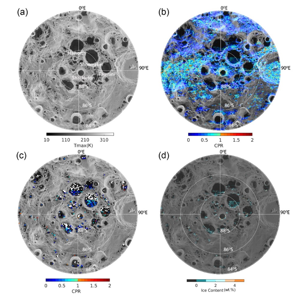图2 月球南极地区(84°-90°S)的多手段数据综合分析图以及水冰含量分布图。(a),月球南极地区的全年月表最高温度图,低于110K为冷阱,提供了水冰长期保存的环境。(b),雷达圆极化比(CPR)图叠加在全年月表最高温度图上,雷达阴影区没有圆极化比信息,因此无颜色覆盖。(c),全年月表最高温度图上标记月球矿物成像仪(M3)识别的月表暴露水冰位置,颜色代表通过插值计算的雷达CPR值,白点代表位于雷达阴影中的M3水冰位置,因此没有CPR信息。(d),水冰含量上限分布图叠加在全年月表最高温度图上,颜色代表水冰含量