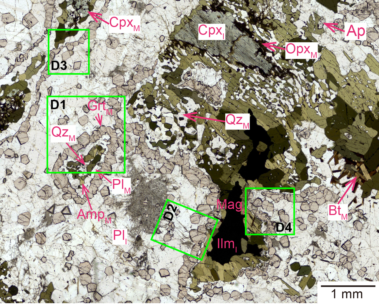 图1 变辉长岩显微岩相照片。该变辉长岩经历部分麻粒岩化,峰期阶段以在残留岩浆期矿物单斜辉石(CpxI)和斜长石(PlI)的交界处发育的多层变质冠状体为特征,冠状体自CpxI向PlI包括:第一层AmpM + QzM ± OpxM ± CpxM ± BtM,第二层PlM,第三层GrtM