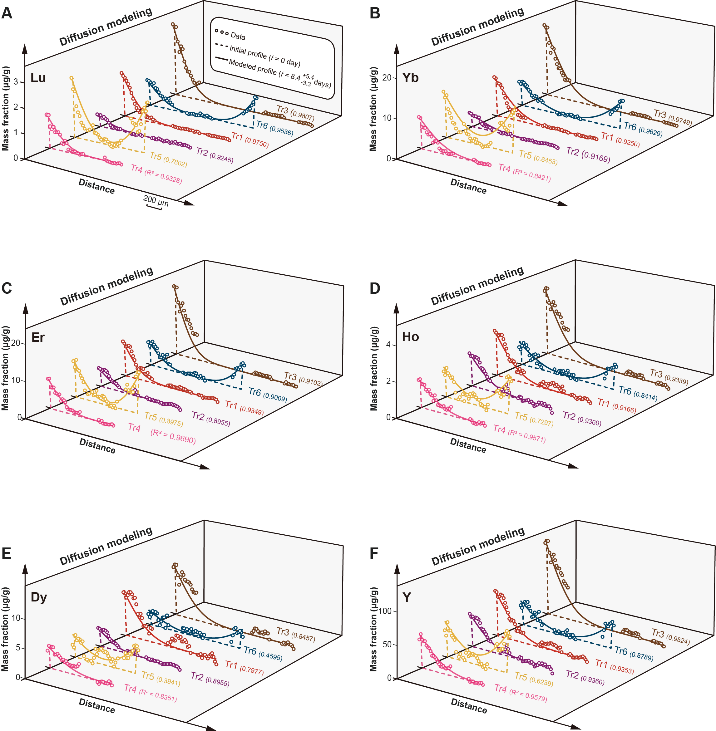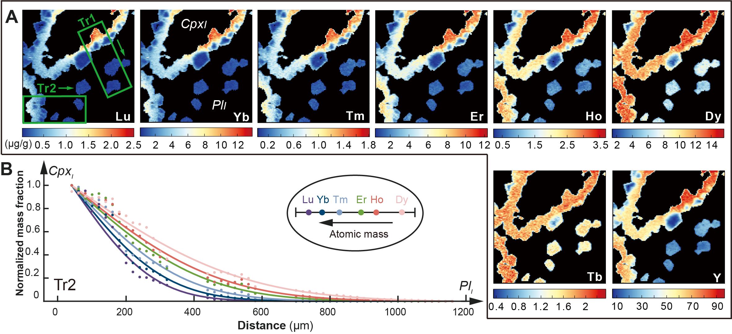 图2 变辉长岩中跨越石榴子石的HREE+Y定量成分面扫描图(A)和提取的HREE成分剖面(B)。其中,B图的HREE成分来自于矩形条带Tr2(见图2A),所有元素被归一化为0到1。剖面曲率随HREE原子质量的增加而增加,表明扩散速率降低。该相对扩散速率与HREE在石榴子石晶内中的扩散规律不符,相反,与HREE在熔体中的规律完全一致