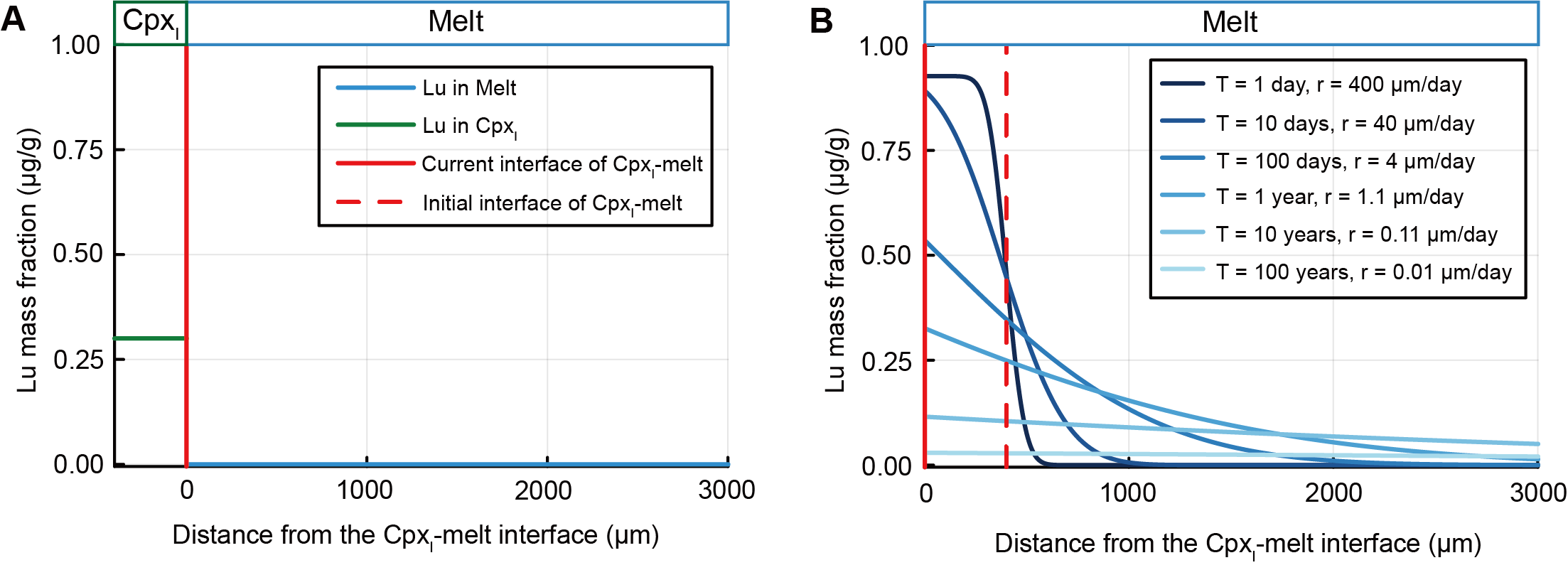 图4 变辉长岩移动边界条件扩散模拟,以Lu元素为代表。(A)Lu在CpxI和熔体中的初始含量;(B)Lu在熔体中的扩散曲线,因时间尺度不同(1天到100年),CpxI的分解速率也不同(0.01 µm/天到400 µm/天)。CpxI–熔体界面伴随CpxI的分解而向后者移动。当扩散时间尺度小于1年时,可保留明显的扩散环带;反之则扩散剖面将被抹平