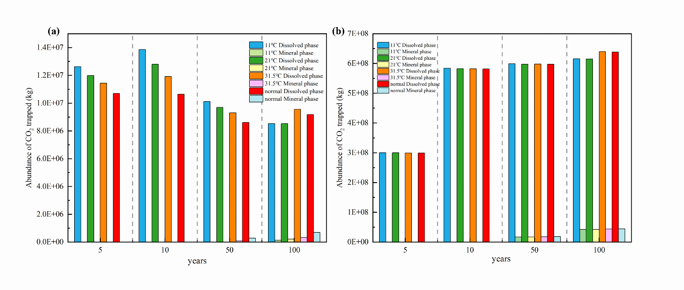 中国科学院地质与地球物理研究所赫建明研究员团队利用TOUGHREACT软件建立了储-盖层二维流动模型和储-盖层水-岩反应模型。研究了不同温度下二氧化碳注入后的流动过程、水岩相互作用以及封存机制的时空动态演化,包括二氧化碳羽流迁移、热传导、溶质运移以及不同封存机制随时间的贡献。具体分析了注入温度如何增强或抑制各种封存机制。