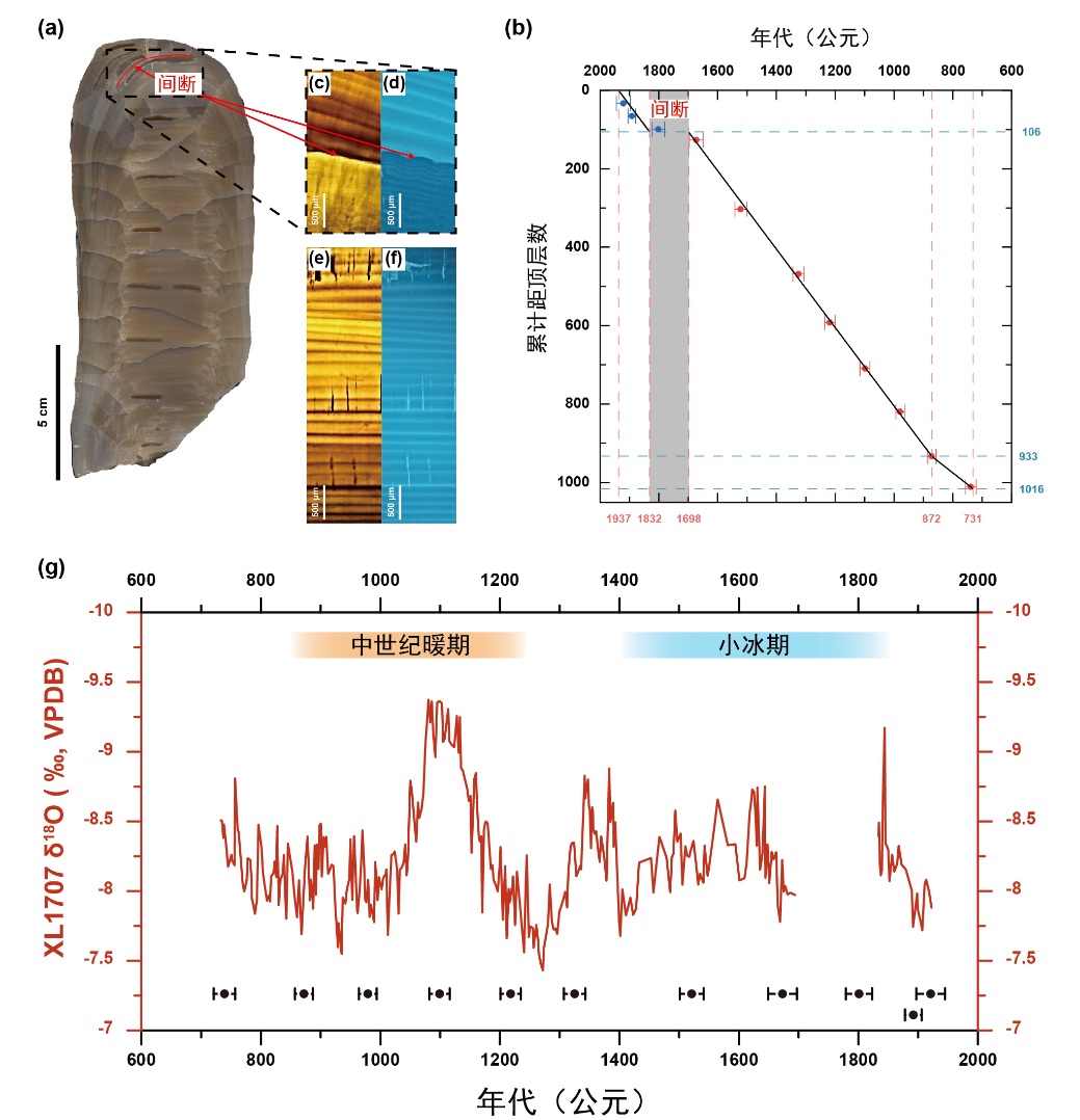 图1 河北兴隆溶洞石笋XL1707样品剖面(a),年代模型(b),透射光显微镜(c和e)与荧光显微镜下(d和f)的纹层结构,以及δ18O序列(g)