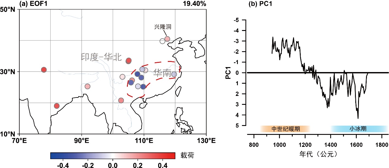 针对以上问题,中国科学院地质与地球物理研究所博士生肖正逸,在导师段武辉副研究员和谭明研究员指导下,联合北京大学沈佳恒研究员,以及本所铀系年代实验室王立胜、王学锋高级工程师,对过去千年亚洲石笋δ18O变化的时空特征及其驱动机制开展了系统研究。研究团队在河北兴隆溶洞采集了一根发育年纹层的石笋(XL1707),通过年层计数与230Th定年相结合的方法,新建立了一条具有高精度年代控制的过去千年多年际分辨率石笋δ18O记录(图1)。同时收集了17条已发表的同时期亚洲季风区石笋δ18O记录,通过经验正交函数分析提取了石笋δ18O记录的主导空间模态(EOF)与主成分(PC)。第一空间模态(EOF1)显示华南地区石笋记录大多为负载荷而印度-华北地区的记录为正载荷,第一主成分(PC1)在中世纪暖期期间为负值而在小冰期期间为正值(图2)。