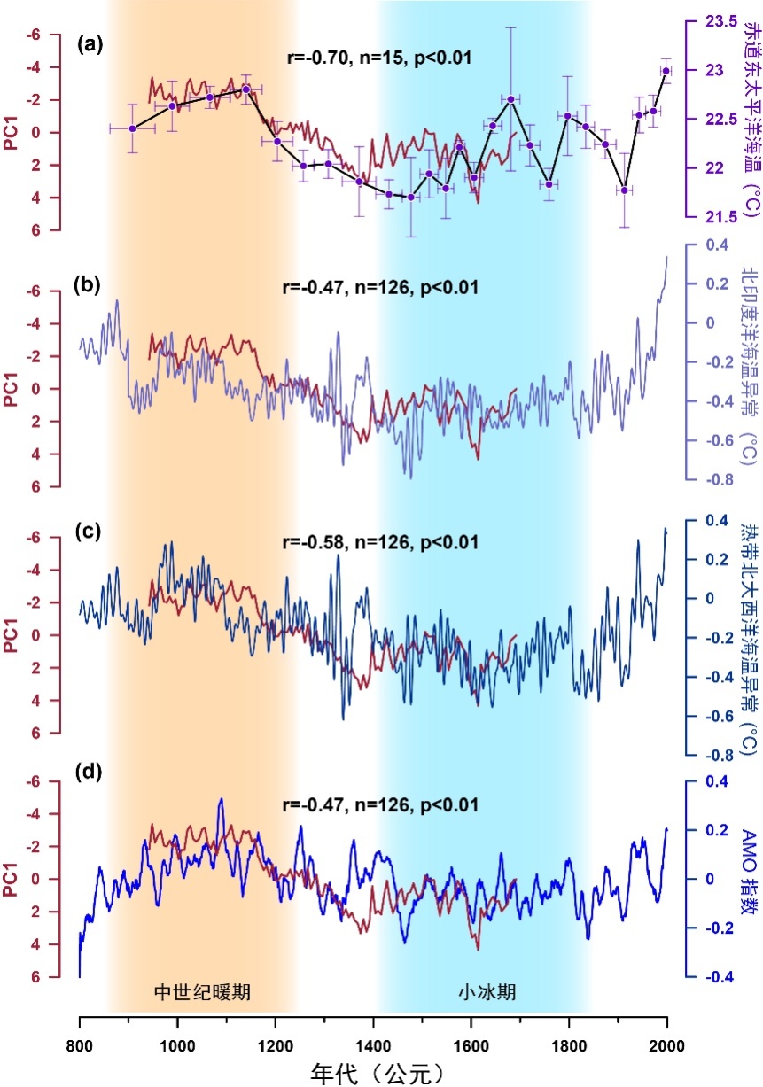 进一步研究发现,过去千年亚洲石笋δ18O记录的PC1与赤道东太平洋、北印度洋、热带北大西洋的海温呈显著负相关(图3),这些区域的海温升高有利于西北太平洋异常反气旋的形成与维持。