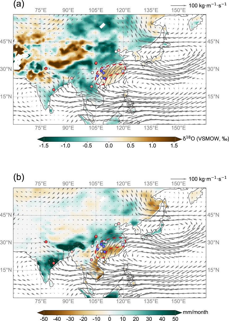 亚洲石笋氧同位素组成(δ18O)长期以来被用于重建季风环流演化历史。过去千年经历了中世纪暖期和小冰期这两个典型的温暖和寒冷气候阶段,对研究气候变化具有重要参考意义。目前已有大量过去千年亚洲石笋δ18O记录发表,为季风演化研究提供了多区域视角。以往研究表明包括华南在内的中国季风区石笋δ18O记录存在一致信号,该信号反映了亚洲夏季风强度变化。最近研究揭示新建立的华南石笋δ18O记录与华北石笋记录呈明显的反相变化模式,并将之归因于降水空间差异的影响。这些新增的石笋δ18O记录,扩充了华南地区研究数据的空间覆盖范围,揭示亚洲石笋δ18O变化存在区别于“一致信号”的精细的空间结构。这进一步引发出两个关键科学问题:过去千年亚洲石笋δ18O变化究竟具有怎样的时空特征?不同地区的石笋δ18O与季风环流系统分别存在怎样的动力学联系?