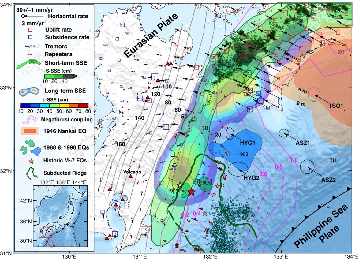 作为海山俯冲构造的经典区域之一,日本西南日向滩俯冲带位处菲律宾板块与欧亚板块的汇聚边界,有着正在俯冲、海底地形显著的九州-帕劳洋脊(图1),是距中国大陆近、地震活动频繁的板块边界,长期为全球地震科学家所关注。2024年8月8日该地区俯冲洋脊内发生了Mw7.1级低角度俯冲型地震(图1,红色五角星),5个月后该地震临近又发生另一个近7级地震(图1,黄色五角星),形成“双震”。两次地震及期间产生的三维地表形变场被该地区的全球导航卫星系统(GNSS)台网所连续观测。该GNSS观测网在过去二十年经历多次台网加密,是全球观测精度和覆盖密度最高的观测系统之一。加之该区域密集的高质量地震台网(如Hi-net宽频带台网),能快速提供高精度区域地震目录。测地学和地震学两种观测网联合观测为深入揭示此次“海山型地震”的断层滑动时空演化过程提供了数据基础。