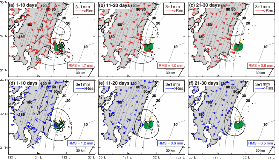 图3 2024年地震后前一个月内,有约束(a-c)和无约束(d-f)的余滑反演残差分布。绿色和棕色色块分别代表2024年和2025年地震的核心破裂区