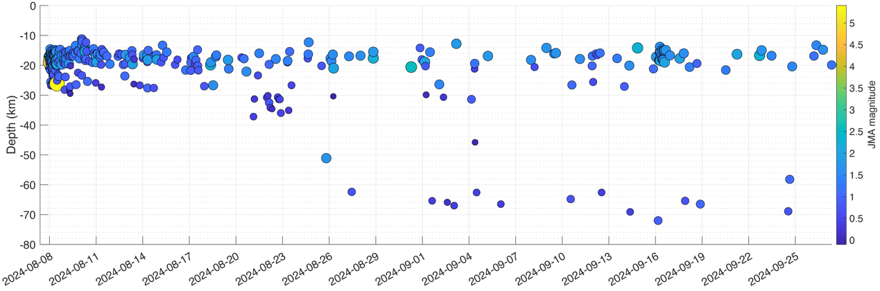 图4 2024年地震后50天内俯冲断层上的余震随时间和深度演化。主震后约1个月,深部60-80 km出现小震