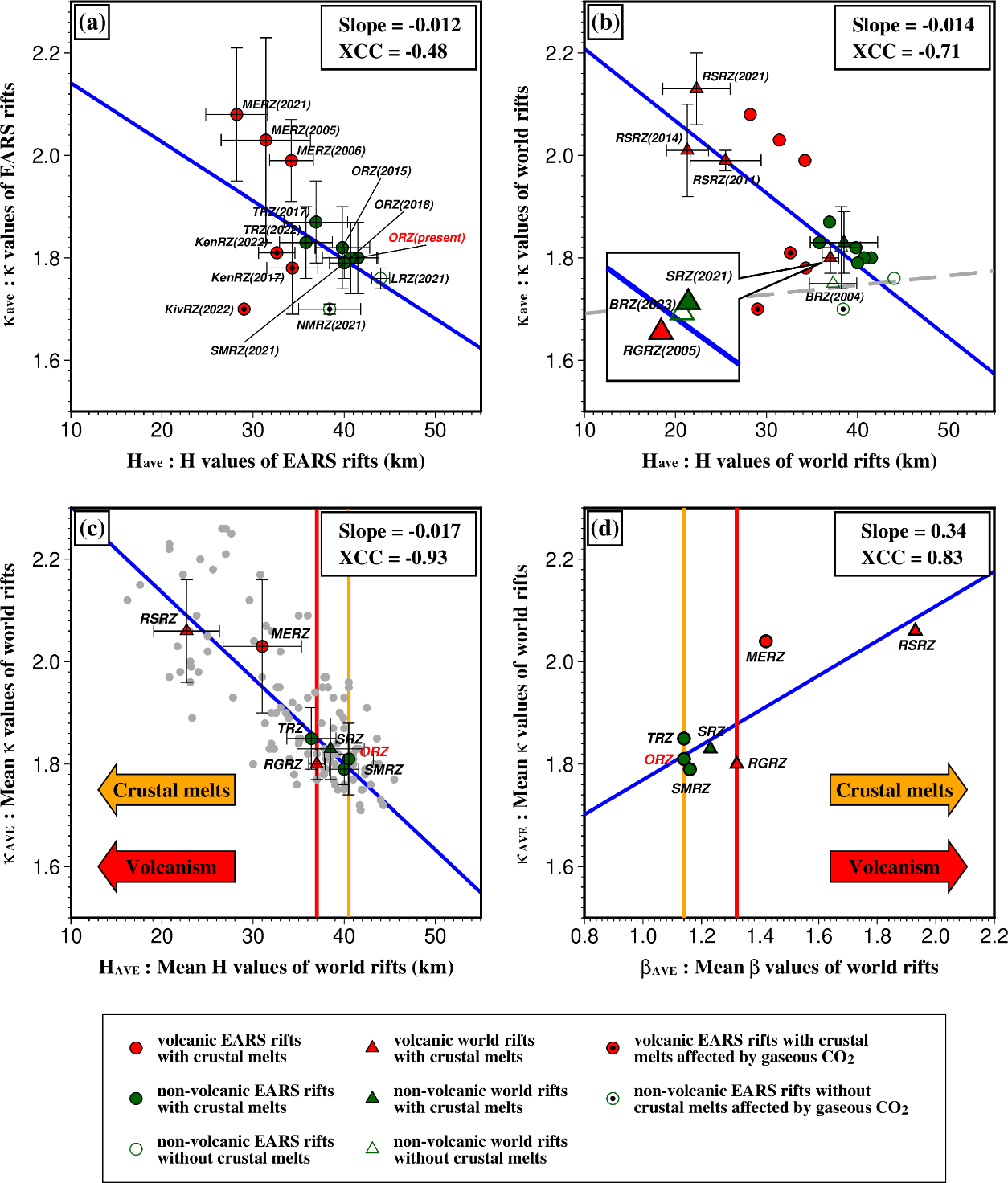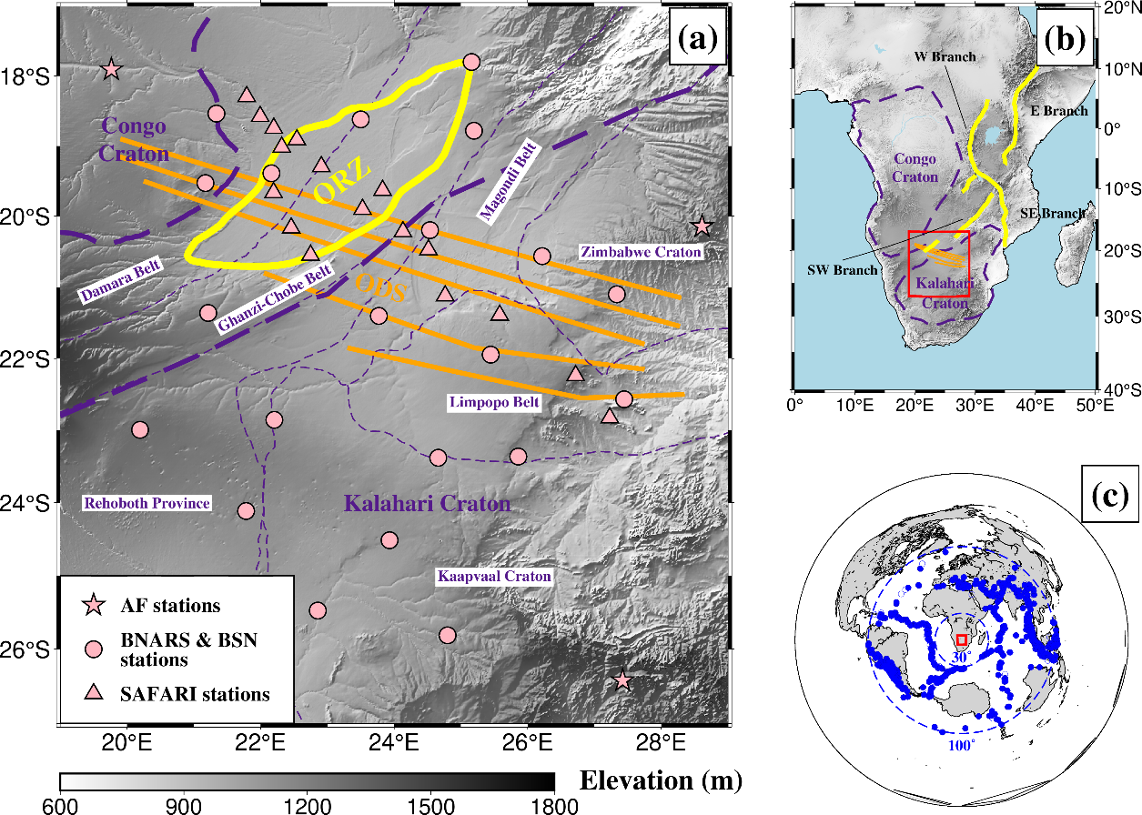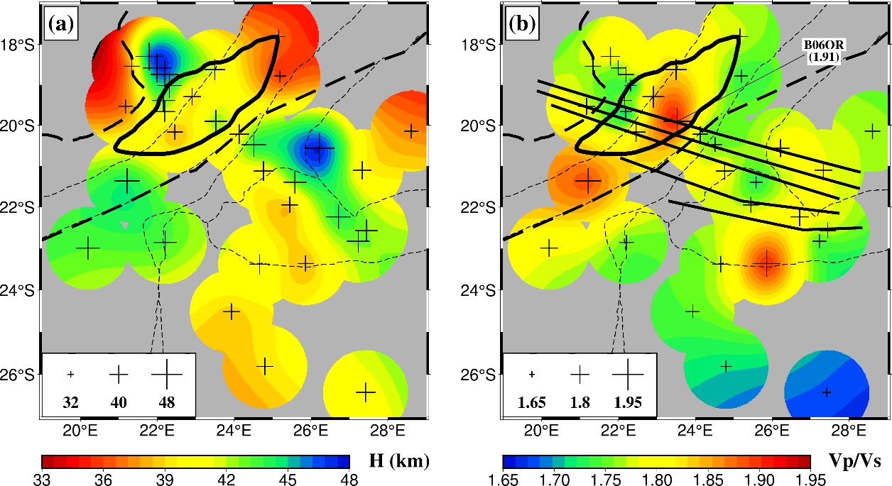 中国科学院地质与地球物理研究所王拓博士后,与合作导师陈凌研究员、美国密苏里科技大学的Stephen S. Gao教授和Kelly H. Liu教授合作,利用接收函数H-叠加方法对Okavango裂谷及其周边地区(图1)的地壳厚度和Vp/Vs值进行研究。研究结果显示(图2a),相较研究区整体而言(∼41.53.2 km),裂谷轴附近地壳(~40.02.2 km)有所减薄,符合裂谷发育初期的地壳特征。该区域地壳平均Vp/Vs值高达~1.850.05(最高值为1.91;图2b中台站B06OR),显著高于全球平均值1.78。高地壳Vp/Vs值通常指示基性或超基性幔源物质侵入,因此Okavango裂谷壳内基性物质可能与切穿裂谷的Okavango岩墙群(图1中ODS)有关。值得注意的是,当地壳平均Vp/Vs值超过1.82时需考虑熔融的影响,因此Okavango裂谷地壳内可能存在熔融物质。
