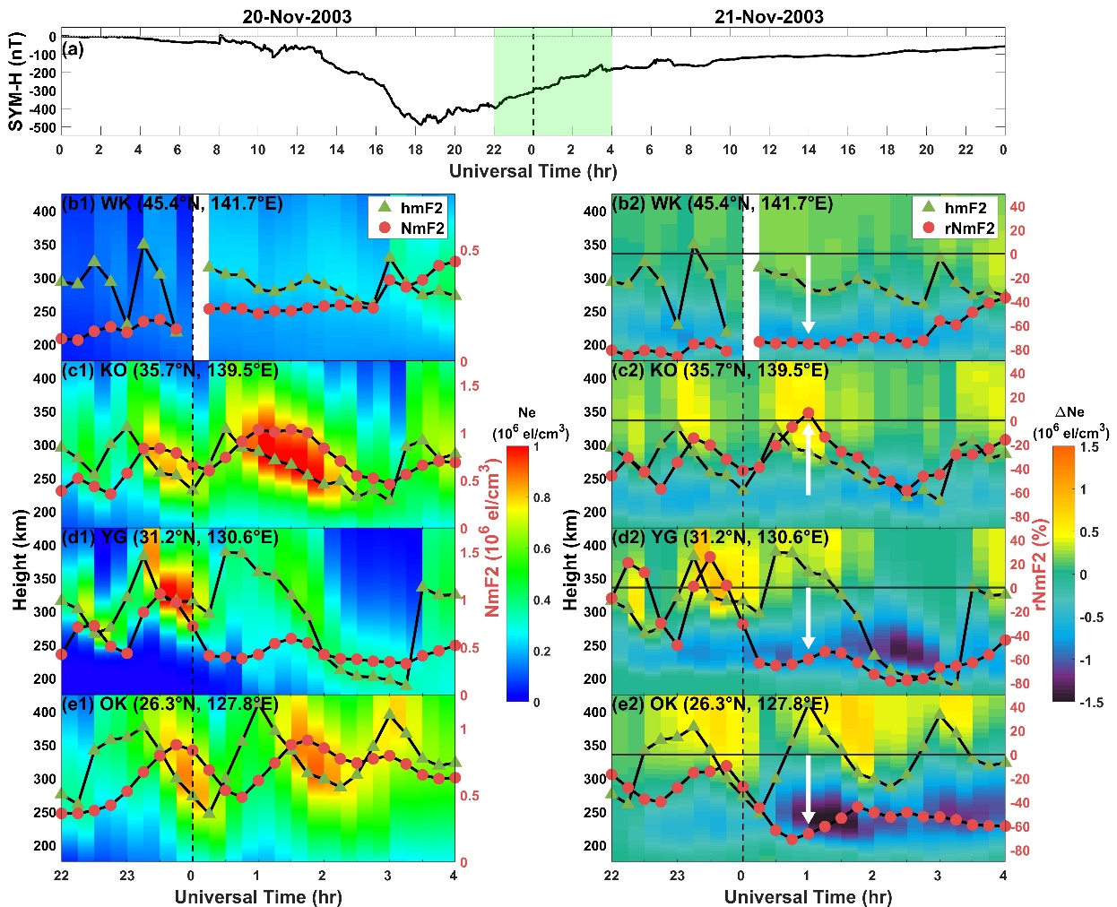 图3 (a)SYM-H指数(用于衡量地磁活动);(b1–e1)日本地区WK、KO、YG和OK站的电子密度剖面变化,叠加了hmF2(绿色三角形)和NmF2(红色实心点);(b2–e2)hmF2(绿色三角形)和NmF2的相对变化rNmF2%(红色实心点),叠加了电子密度剖面的绝对变化ΔNe。白箭头突出了rNmF2的不连续纬度变化
