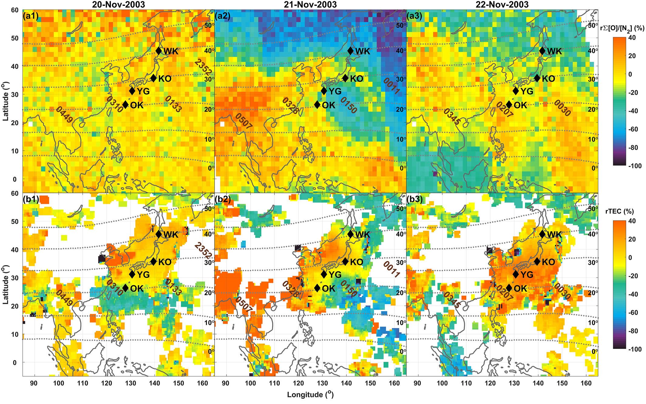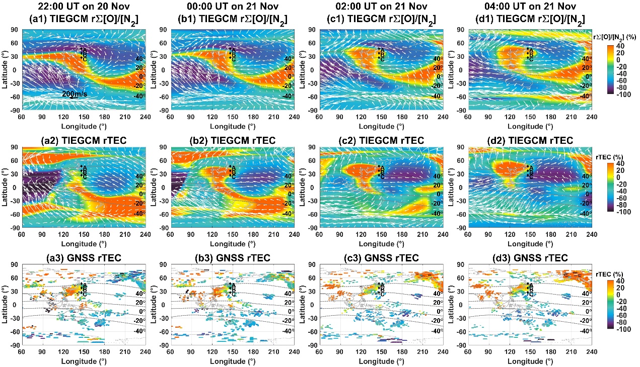 图1 (a1-a3)2003年11月20日至22日期间,GUVI r∑[O]/[N2]分布。每个轨道的平均UT用红色字体标记在图上;(b1-b3)沿GUVI轨道采样的合成rTEC图。黑色菱形代表电离层测高仪的位置