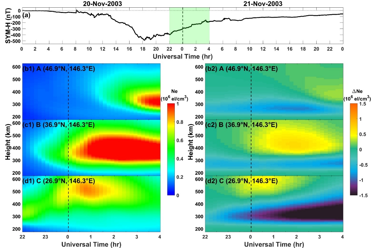 图5 (a)SYM-H指数(用于衡量地磁活动);(b1-d1) A、B和C在2003年11月20日22:00 UT到21日04:00 UT期间的电子密度(Ne)高度剖面;(b2-d2) 上述位置的电子密度剖面绝对变化(ΔNe)