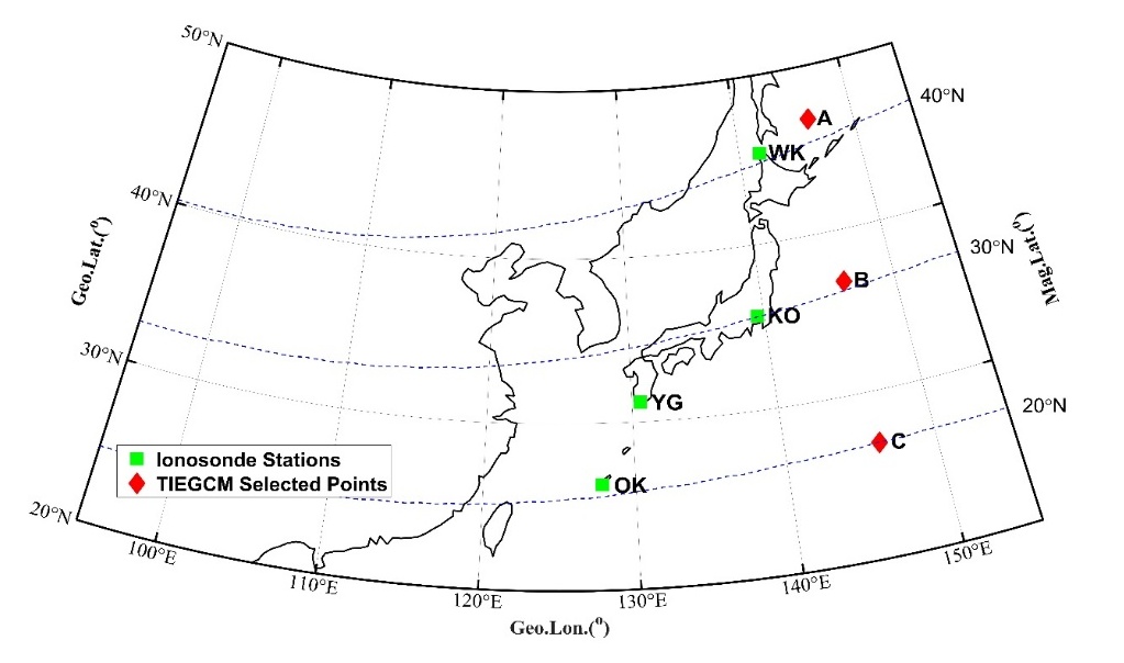 研究人员结合地面测高仪的观测,分析了日本地区四个电离层测高仪的数据,分别是Wakkanai站(WK)、Kokubunji站(KO)、Yamagawa站(YG)以及Okinawa站(OK)(位置见图2绿色方形所示)。