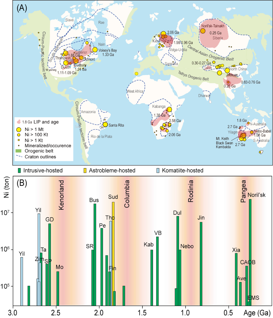 图1 (A) 全球镍铜硫化物矿床及其对应时代的大火成岩省分布图;(B) 镍铜硫化物矿床的时代分布及其与超大陆聚合-裂解的关系