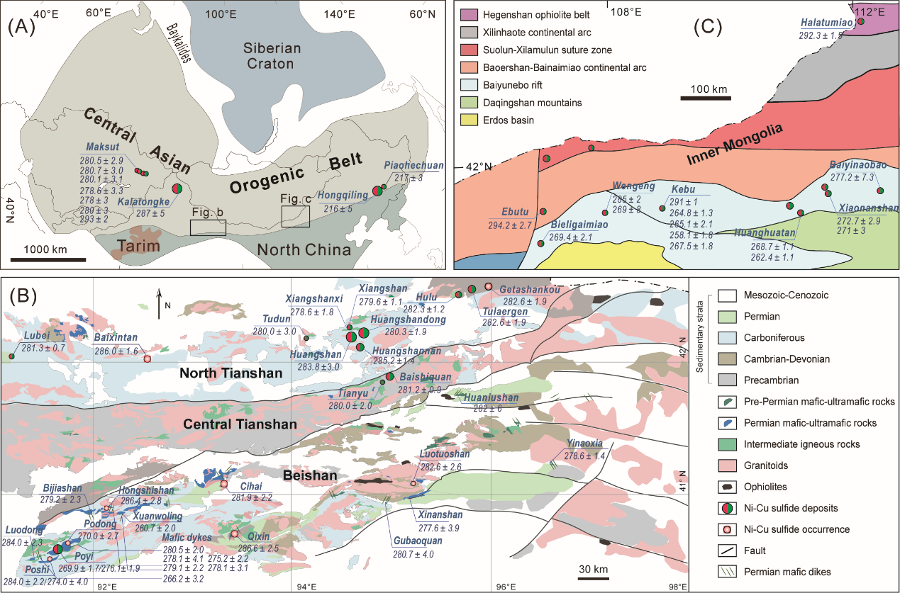 地幔柱通常在大克拉通或大洋板块下方形成大规模火成岩省(LIPs)(图1),但其在小克拉通中的活动机制及其与相邻造山带的相互作用尚不明确。塔里木克拉通作为全球最小克拉通之一,其晚古生代地幔柱事件(300–270 Ma)与中亚造山带(CAOB)南部大量铜镍硫化物矿床(图1)的成因关联长期存在争议。中国科学院地质与地球物理研究所秦克章研究员联合国际团队,通过对塔里木地幔柱与中亚造山带南部镁铁–超镁铁质岩体的时空耦合分析(图2),提出突破性认识: