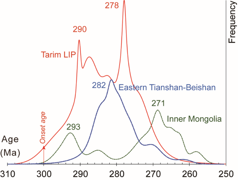 图3 塔里木大火成岩省、东天山-北山造山带以及内蒙古中部地区镁铁质-超镁铁质岩体年龄统计图