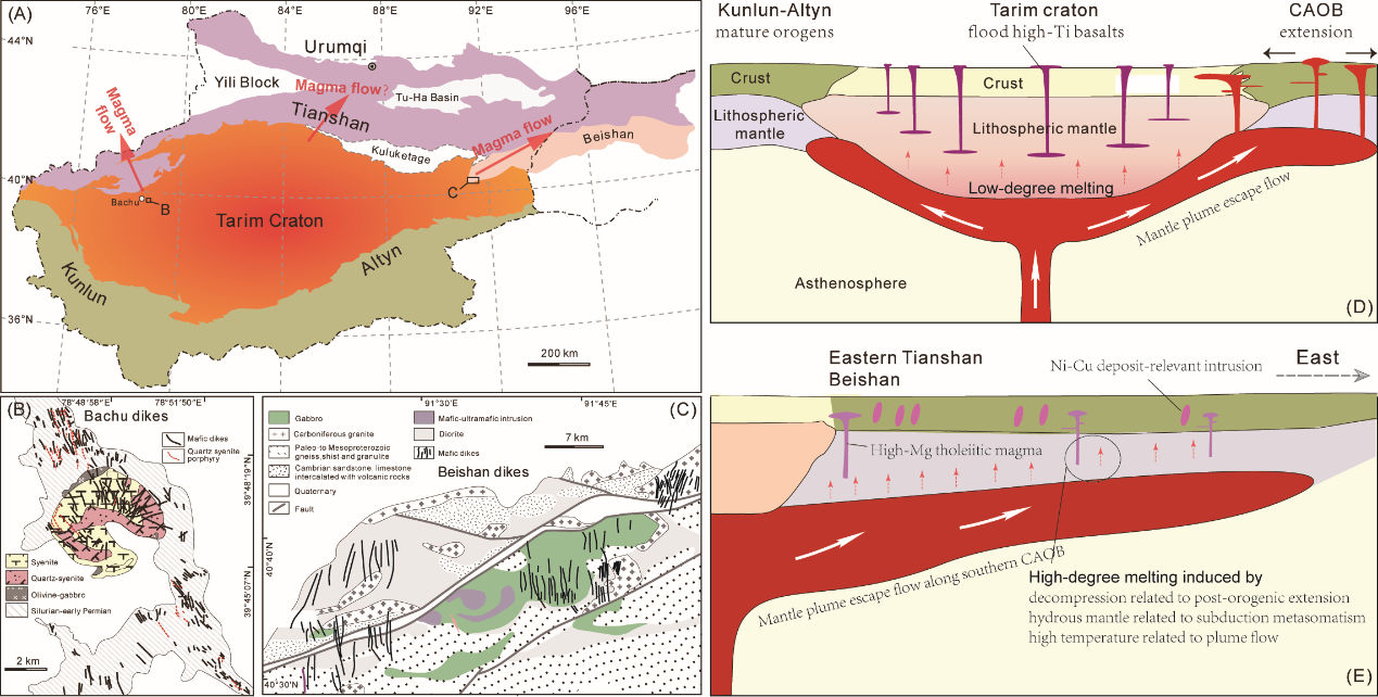 图4 (A) 塔里木克拉通构造格架图;(B,C) 巴楚和北山最西段镁铁质岩墙分布图;(D,E) 塔里木地幔柱模型及其部分岩浆沿中亚造山带侧向逃逸示意图