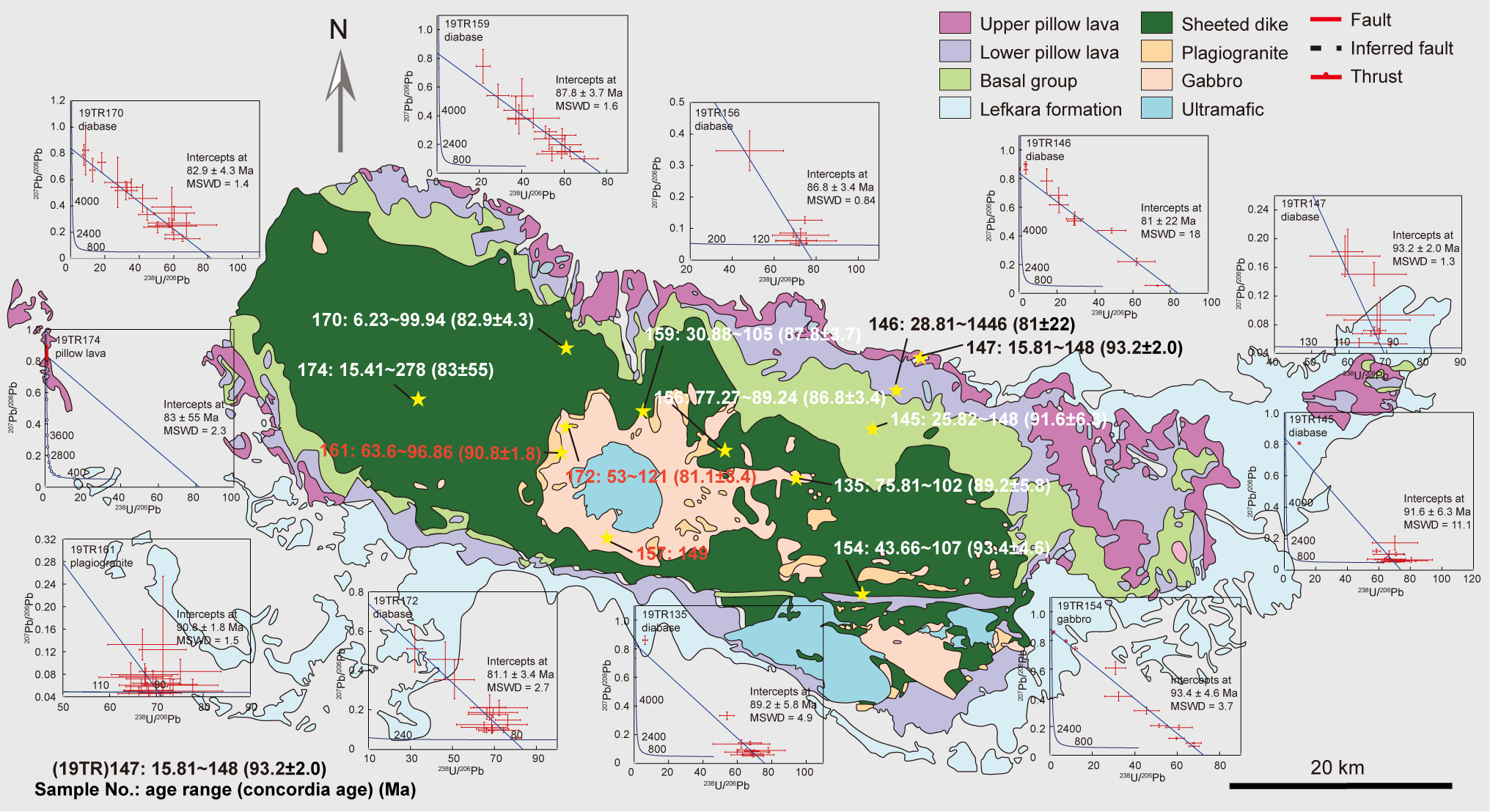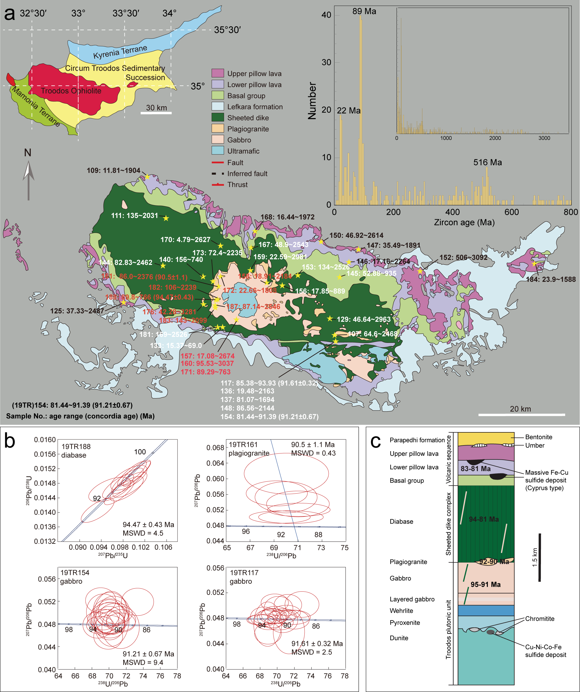 图1 塞浦路斯Troodos蛇绿岩地质图及岩浆岩中的锆石年龄分析结果