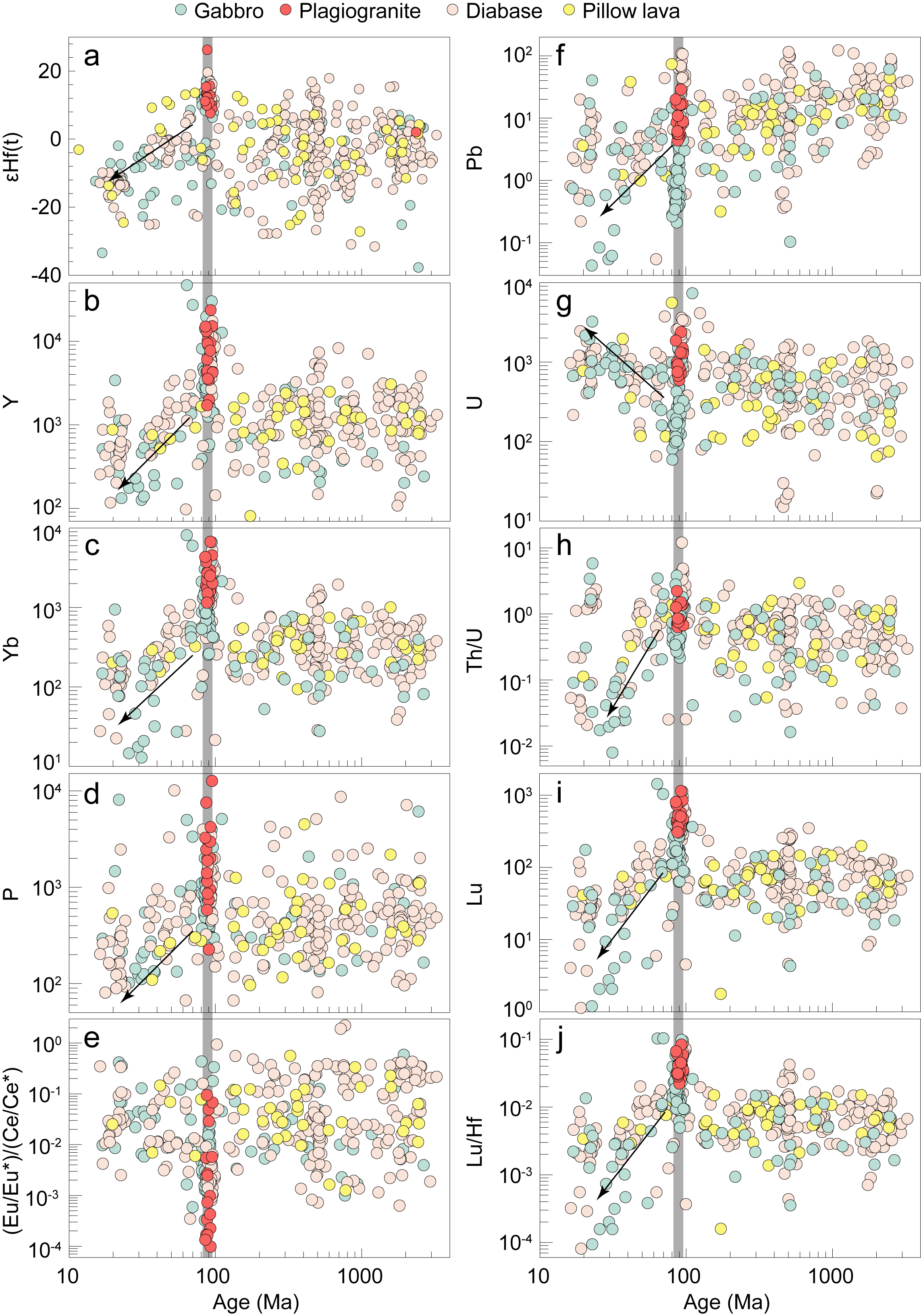 图5 塞浦路斯Troodos蛇绿岩岩浆岩中锆石的Hf同位素组成及微量元素含量及比值随年龄的变化