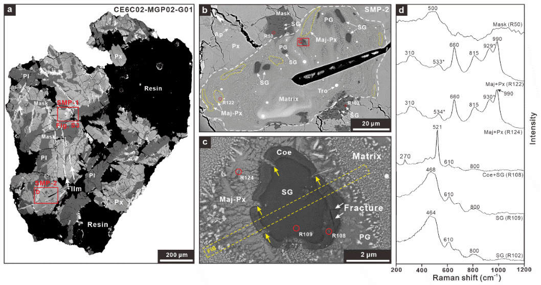 中国科学院地质与地球物理研究所行星科学与前沿技术重点实验室周湛博士与其导师胡森研究员、以及我所嫦娥六号突击队,对近期返回的嫦娥六号月壤展开了高压矿物方面的研究。嫦娥六号(CE6)月壤来自月球南极-艾特肯盆地,该地体被认为是小行星撞击形成的撞击盆地,因此,嫦娥六号月壤为研究月球的冲击变质作用和撞击事件提供了重要契机。他们在一颗嫦娥六号月海玄武岩岩屑(MGP02,G01)中发现两个由小行星或陨石撞击形成的冲击熔融囊(shock-induced melt pockets, 图1a-b),在其中一个冲击熔融囊中发现了柯石英与镁铝榴石,熔融囊周围的斜长石已熔长石化。柯石英与二氧化硅玻璃共生,主要产出于二氧化硅颗粒的边部,呈现环状形态与较高的衬度(图1c),其拉曼光谱与柯石英的特征谱峰相同(图1d)。熔融囊内部可见辉石成分的重结晶矿物,拉曼分析结果显示为镁铝榴石与辉石集合体(图1d)。