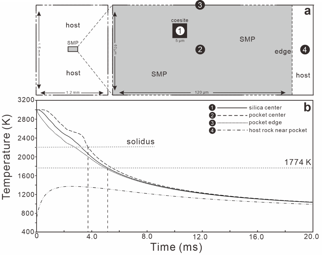 结合柯石英、熔长石、镁铝榴石等高压矿物的组合关系,他们限定了撞击事件的峰值温压条件,其中峰值压力约为24 GPa,峰值温度约为3000 K。基于发现的高压矿物,他们通过有限元热传导模拟估算冲击熔融囊冷却到柯石英形成并保存的时间约为4 ms(图3),并据此构建了完整的冲击压力-温度-冷却历史的轨迹,以及柯石英的形成机制(图4)。