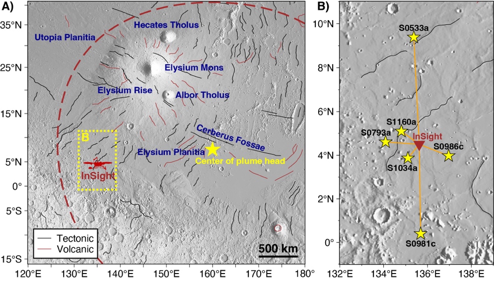 图1 “洞察”号及陨石撞击位置图。A)洞察号着陆区构造背景图。InSight为“洞察”号着陆点;红色细线表示火山断层,黑色细线表示构造断层,红色虚线表示地幔柱范围,黄色五角星为地幔柱中心位置;B)研究使用的6个陨石撞击事件位置图,陨石位置已通过卫星影像确认