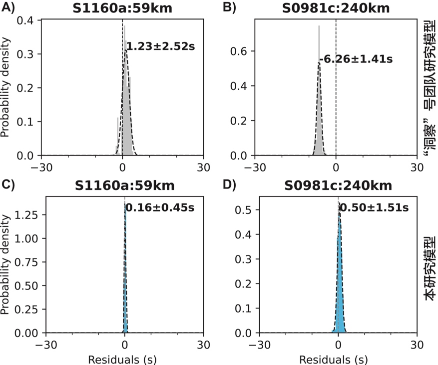 图2 不同结构模型精度验证。A-B:原“洞察”号研究模型的火星地震事件旅行时残差,分别为S1160a和S0981c(上排);C-D:该研究模型的火星地震事件旅行时残差(下排)。残差越小,模型精度越高