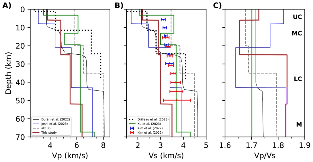 图3 研究获得的平均模型与“洞察”号研究研究团队的平均模型对比。A)P波速度模型;B)S波速度模型;C)波速比模型。UC—上地壳,MC—中地壳,LC—下地壳,M—地幔
