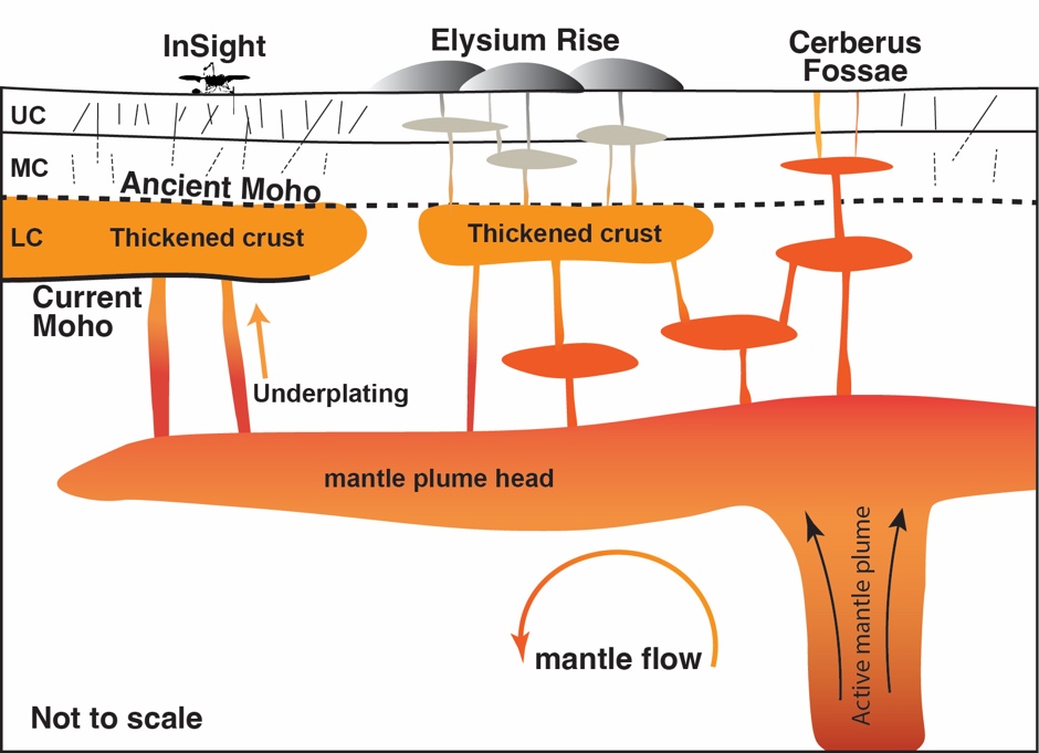 (3)研究团队对上述研究结果做了综合解释。已有的热学计算、陨石样品稀土元素和同位素分析结果表明,早诺亚纪火星地壳厚度约为20–30公里,这与本研究给出的壳内25±8公里分层界面高度一致,推断该界面可能是早诺亚纪的古莫霍面;重力研究揭示埃律西昂火山平原下方存在大型地幔柱,地震学研究表明现今火星地壳厚达52±9公里,且下地壳和上地幔存在部分熔融。基于此,提出了火星地壳自早诺亚纪以来持续生长和加厚的演化模型(图4)。