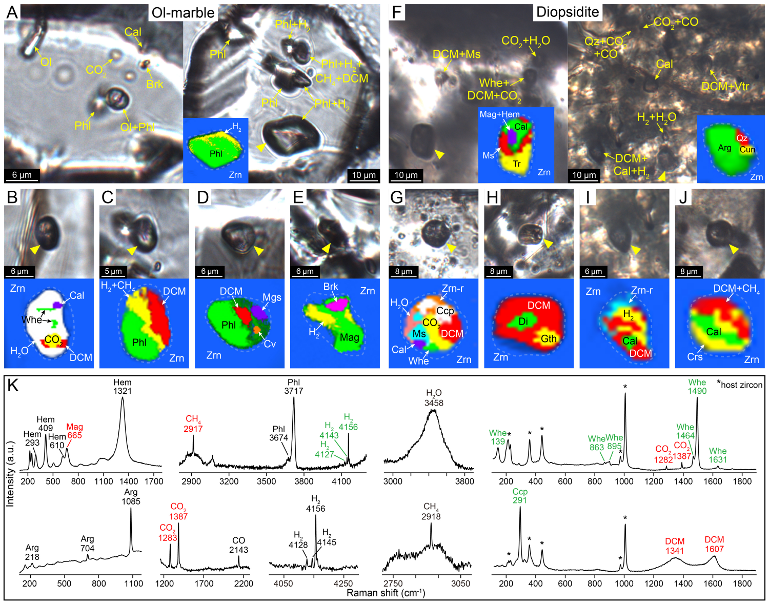 图2(A−E)橄榄石大理岩和(F−J)透辉石岩中锆石包裹体的显微照片及拉曼图像;(K)代表性拉曼光谱图